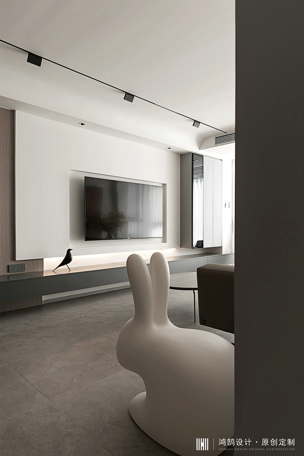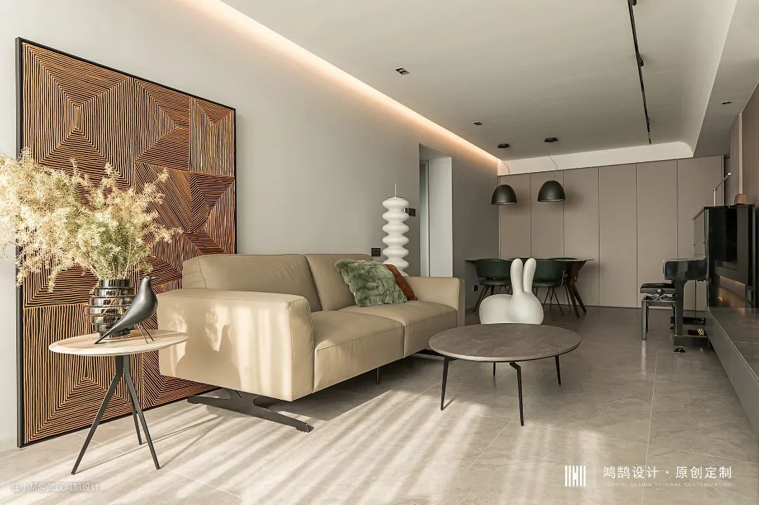 沙发背景墙采取乳胶漆墙面方案,选择比较有质感的芬琳灰色漆,清爽耐看没有过多造型装饰。我们根据空间尺度,选择了偏意式风格家具,全屋家具体量感轻巧,不落地的款式也方便日常地面清洁。