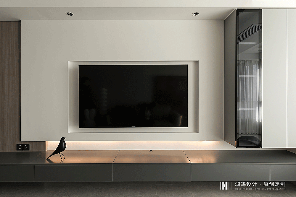 客厅电视背景墙长度比较理想,我们没有采取满柜电视墙设计,而是将整体墙面划分为木格栅板、石膏板、吊柜三段式功能分区,用简约适度的造型进行装饰,同时兼顾了一定的储物功能。