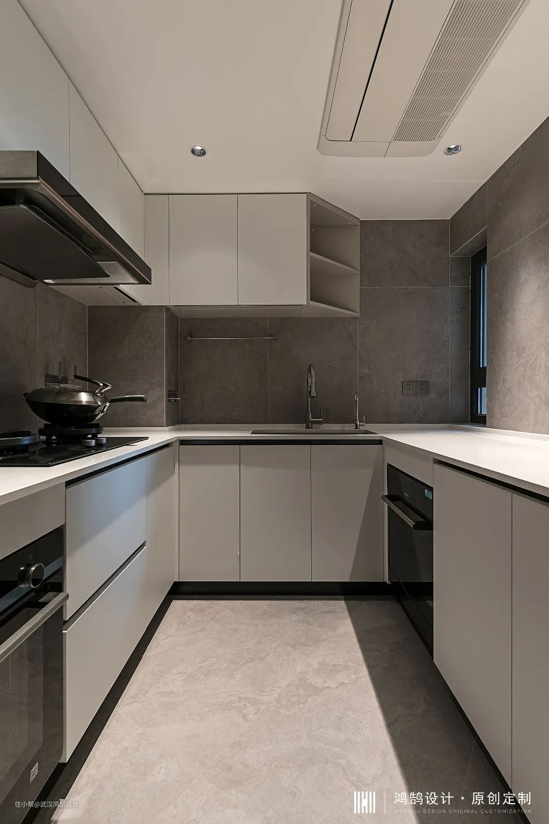 厨房将原先异形的L布局调整为方正的U型,调整后的格局过道与台面空间都得到了释放,厨房的墙面我们用大板石通铺,尽量减少砖缝,减轻厨房清洁压力