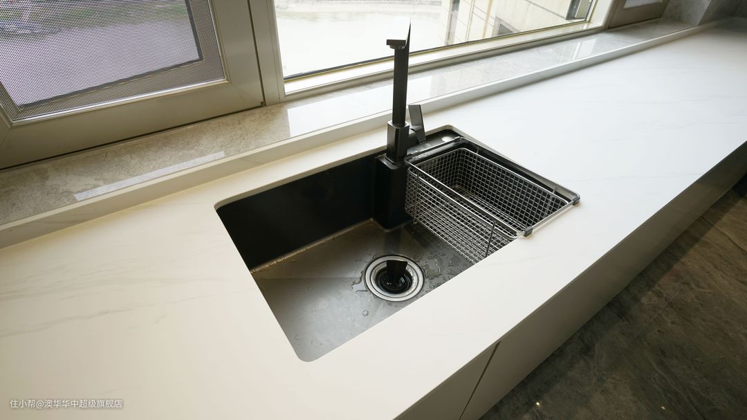纯白橱柜的应用,提亮了整体采光,整体看起来更宽敞,更显简约大气。台面我们使用的是质感高级且易于清理的岩板,安装超大台下盆搭配沥水篮,让生活更便捷。