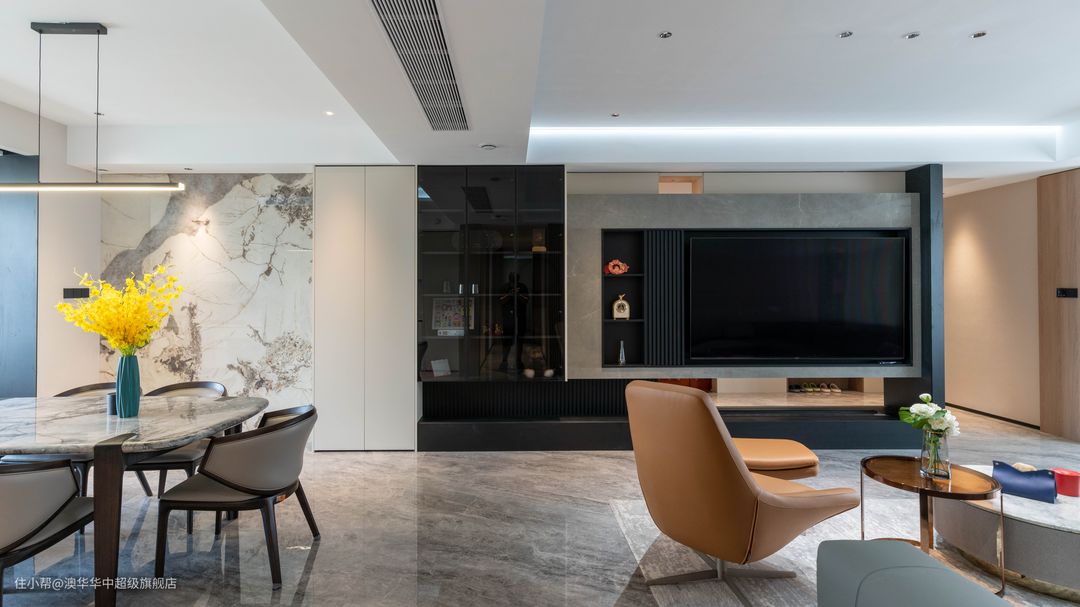 另一侧的墙面以白色储物柜填补墙面凹陷,完美衔接黑玻展示柜,黑白之间,呈现的是高级神秘、简洁大方的基调。剩余墙面以一整块的大理石填充,与餐桌相呼应,材质本身的纹理,自带尊贵高雅气息,彰显业主不凡的生活品味。
