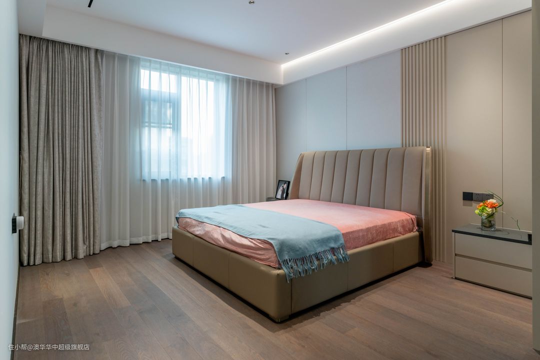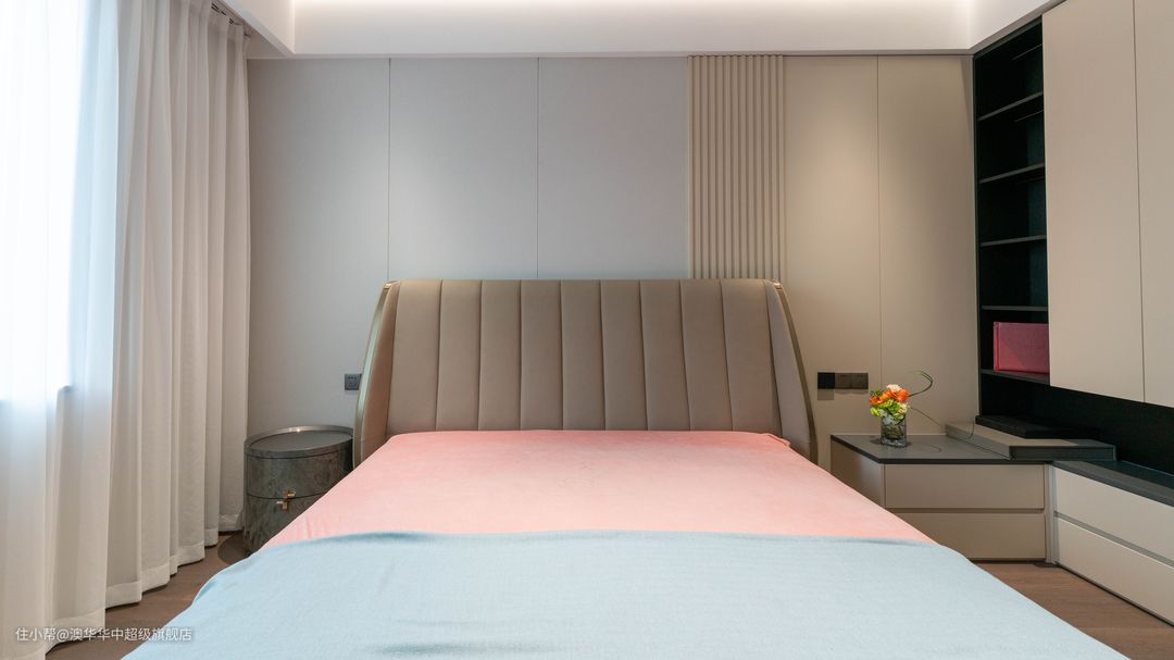 延续客餐厅的设计,于床头墙面添加格栅元素,增添了空间视觉感与层次感。其柔和温暖的配色,搭配无主灯设计,让人更好的放松下来,带来更舒适、更安逸的就寝体验。