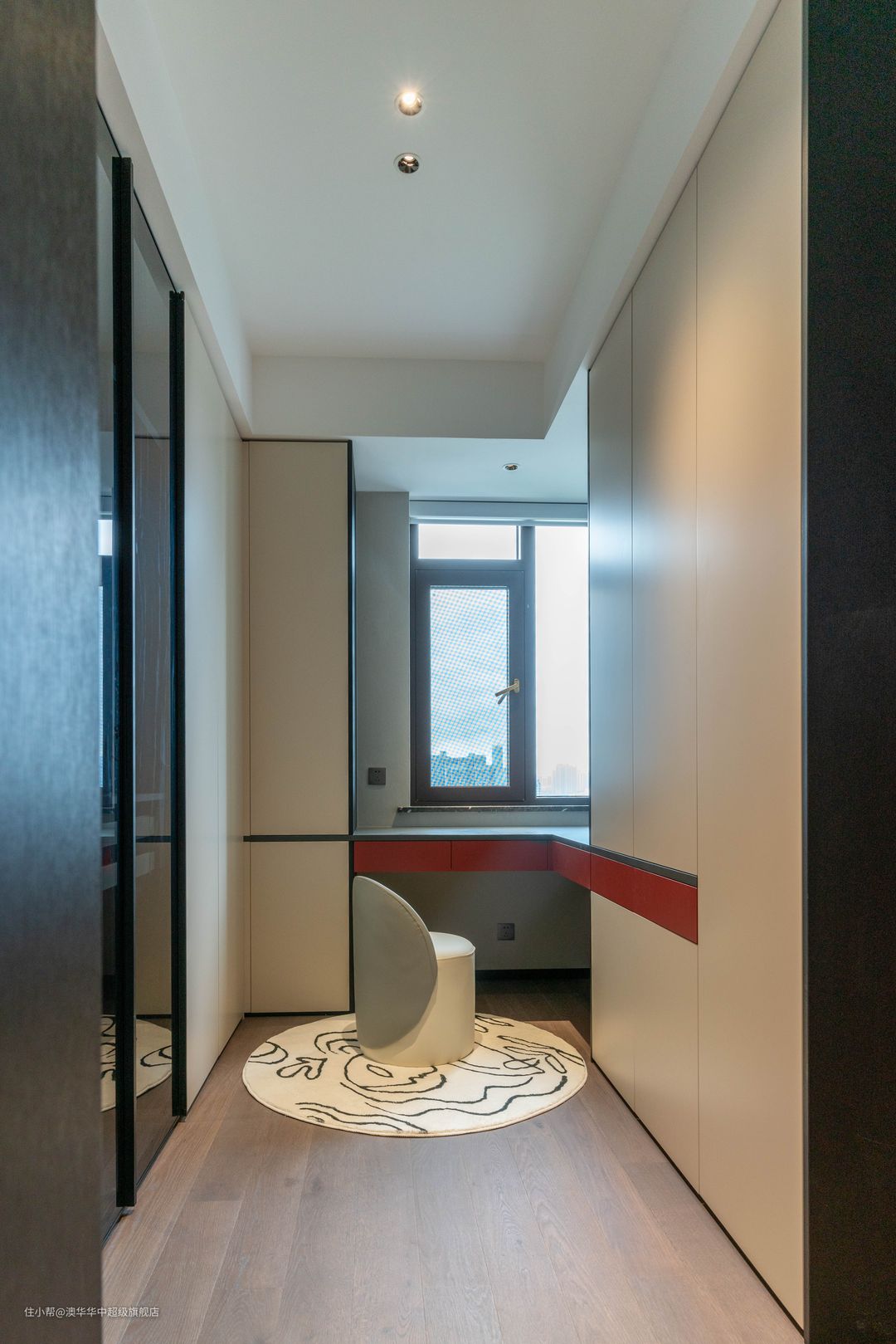 墙体两侧分别做了两组大衣柜,黑玻、实木柜门相间使用,实用又美观。于窗前做悬空梳妆台,完美衔接两组柜体。一抹红色作为跳色置入,带来几分俏皮与明媚,时尚又前卫。
