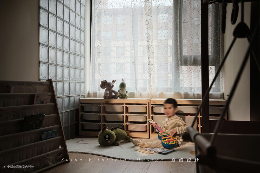 儿童房的玻璃砖墙对应着客厅的拱形窗洞,玻璃砖透光不透视,保护了私密性的同时使房间更加通透明亮,使空间有了联动性,精美的玻璃砖装饰墙面,朦胧的光影感渲染出温馨治愈的场景。