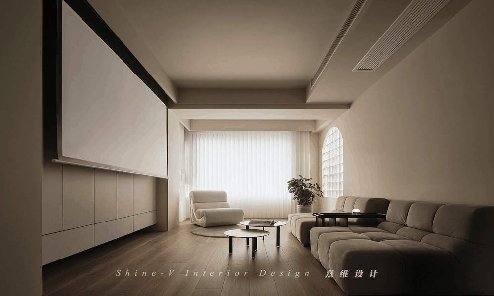 电视背景墙以巨幕投影取代了电视机,闲暇时窝在沙发看看电影,享受影院般大屏幕的沉浸式体验,空闲时将幕布收起来,一整排的白色柜体简洁清爽,获得了超大的收纳空间,提高空间的利用率。