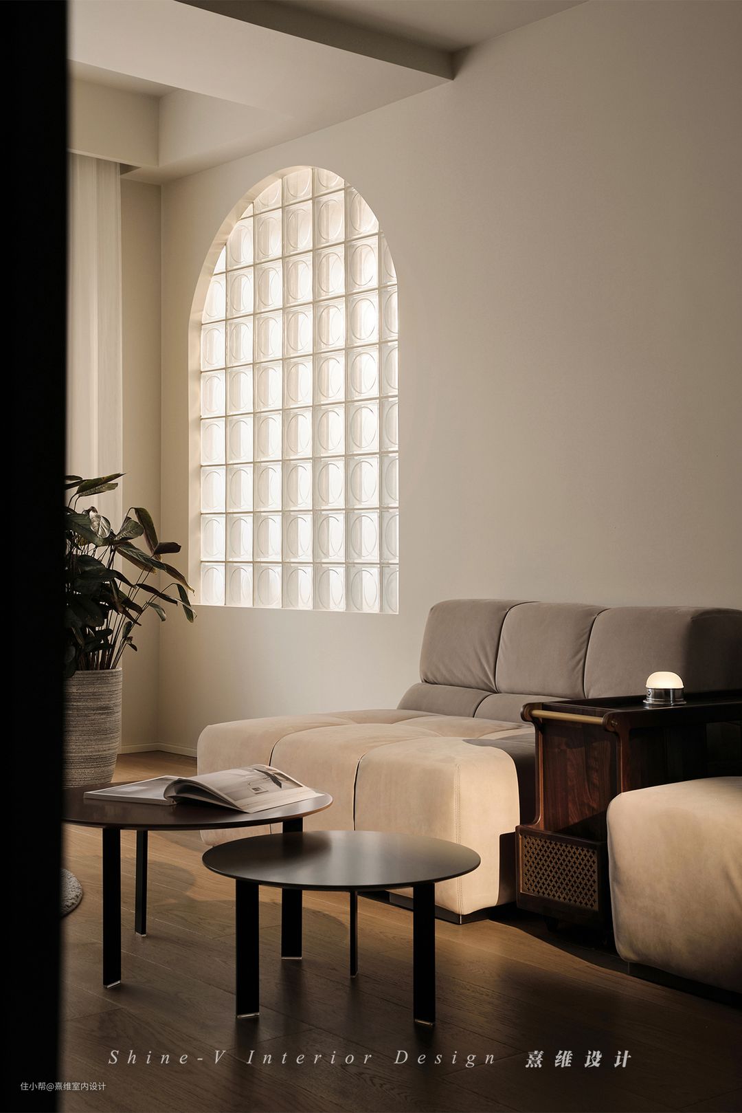 玻璃砖打造出拱形窗的感觉,营造了一种户外田园风氛围,自然地装饰了沙发背景墙,还增强了客厅的采光,朦胧的美感提升整体的韵味,真·氛围高手。 因为考虑到玻璃砖裁切难度大,我们先在墙面做拱形窗洞,然后将玻璃砖整铺于墙后,既解决了施工难度的问题,又完美展现了设计效果。