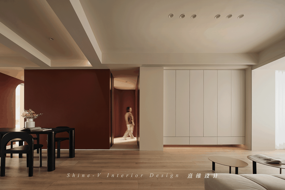 从玄关进入第一抹色彩便是业主喜爱的红棕色背景墙,也是本案的唯一的跳色,我们再将视线延伸至走廊,走廊左侧便是本案的一个设计亮点——超大卫生间干区,位于主次两间卧室的中间,保证了宽敞的使用空间且互不干扰。
