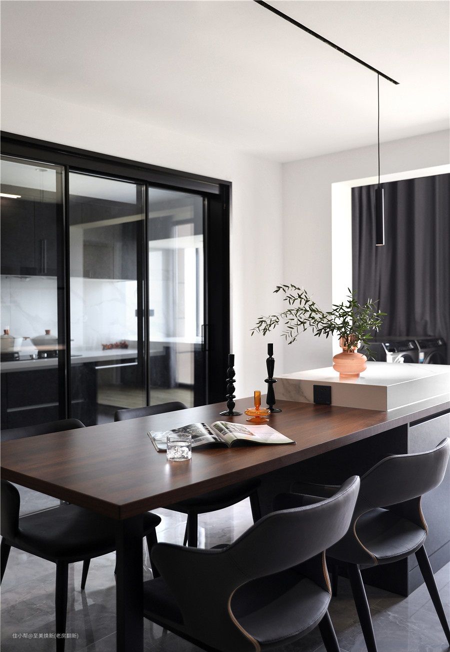 餐厅与中厨之间用玻璃移门做隔断,减少油烟的外散。