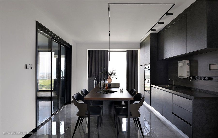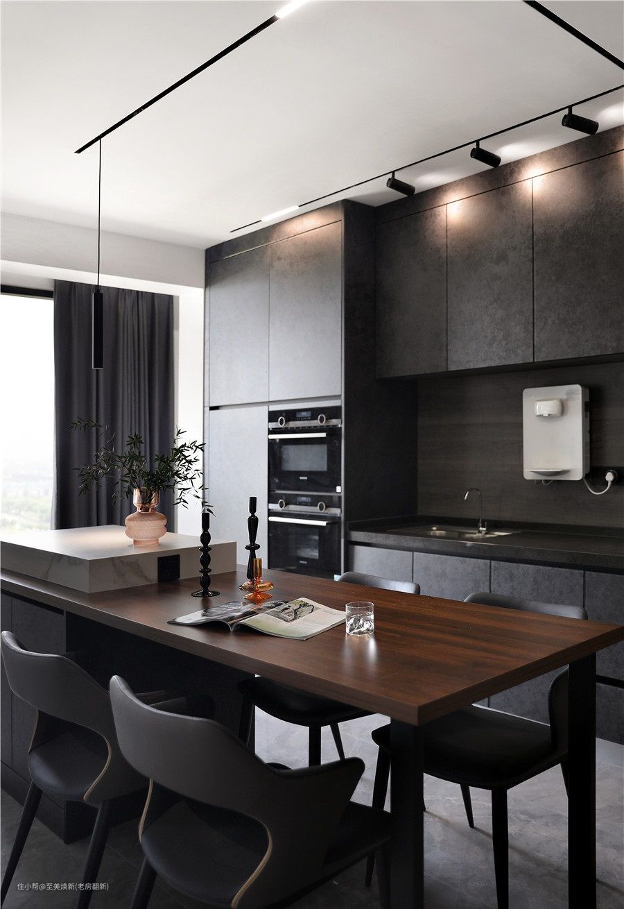 一整面墙的餐边柜超级有整体感,深色色系+轨道射灯的运用显得很高级,很多厨房电器都可以嵌入柜体,非常实用!