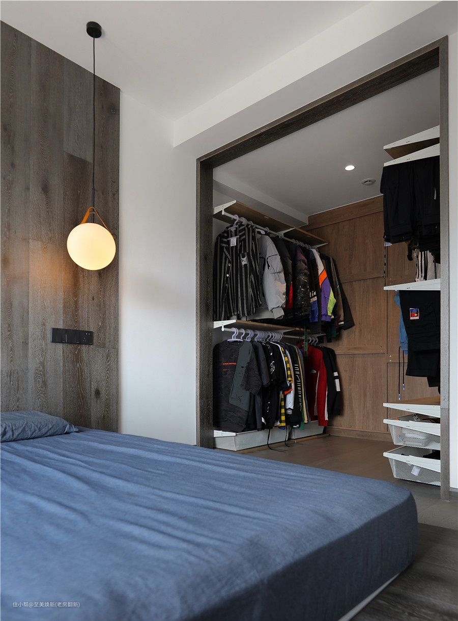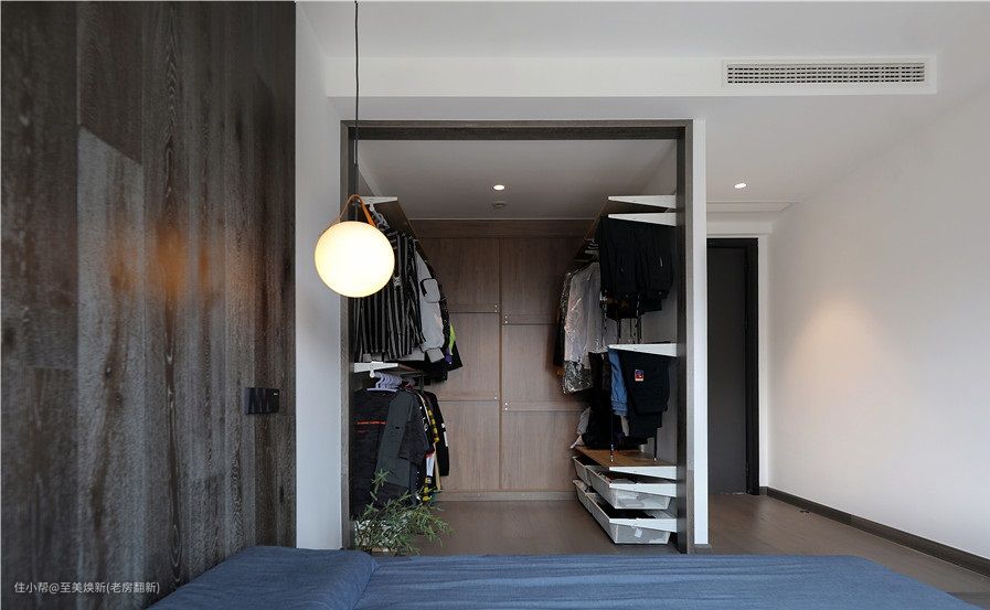 衣柜是开放式的设计,以晾衣架➕抽屉进行按类收纳,衣物这样挂放,拿取更加方便。