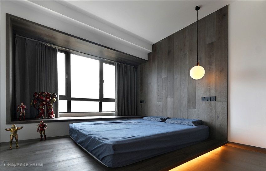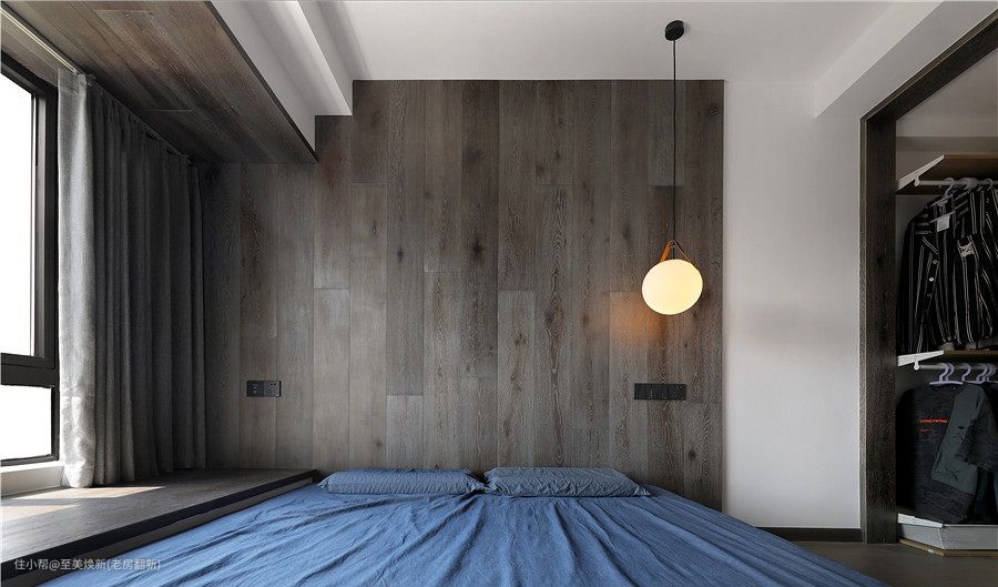 床头背景墙和飘窗沿用同材质的实木木板铺贴,抗污能力强,统一大气又耐看。