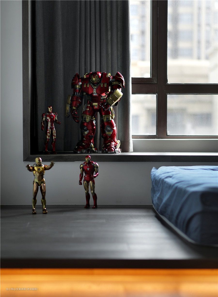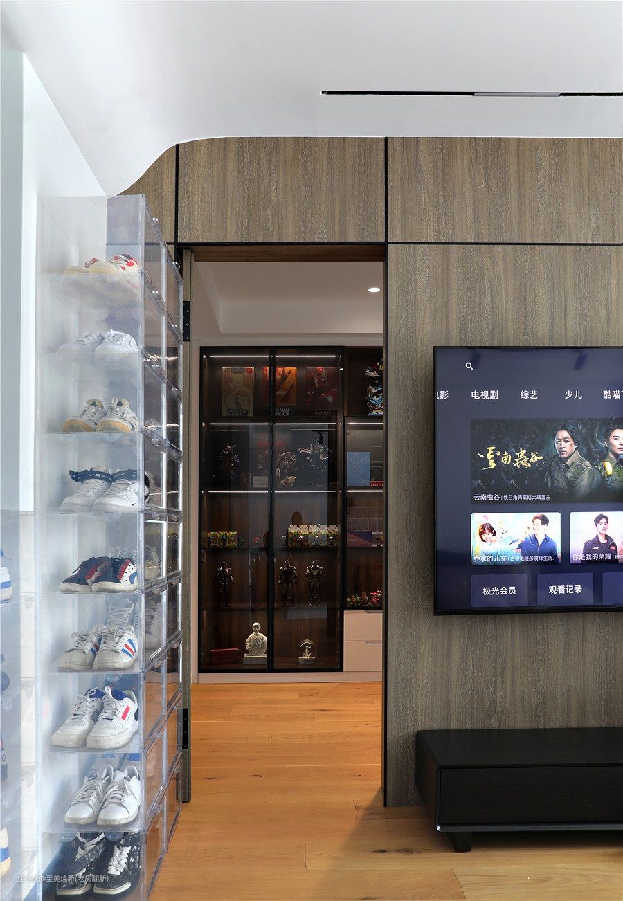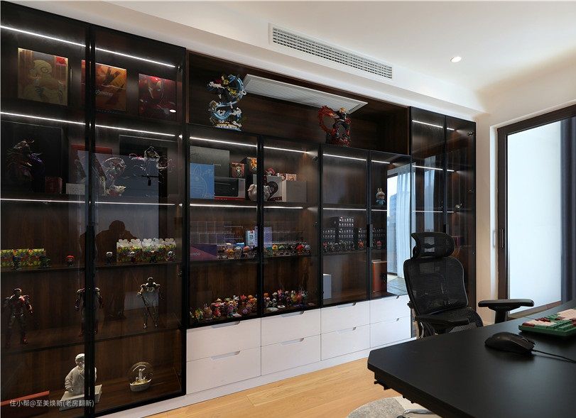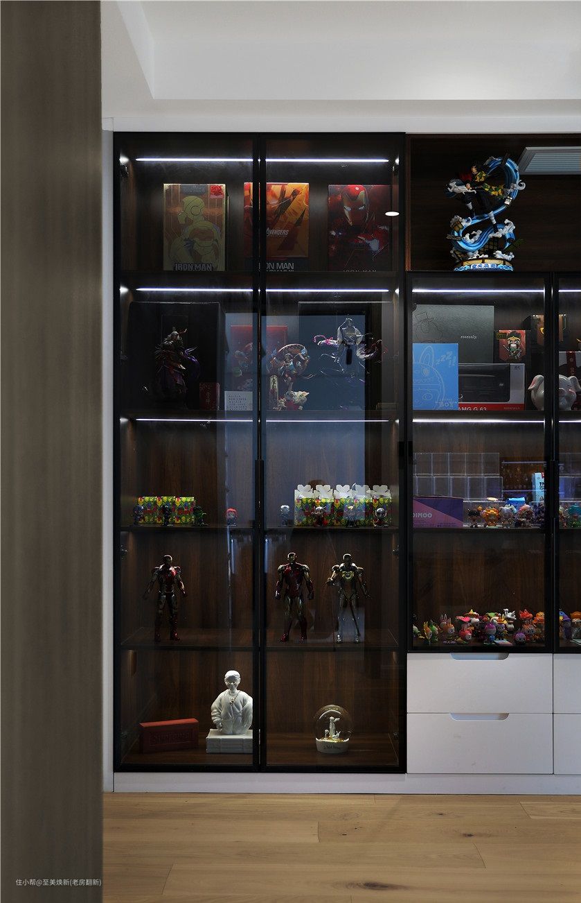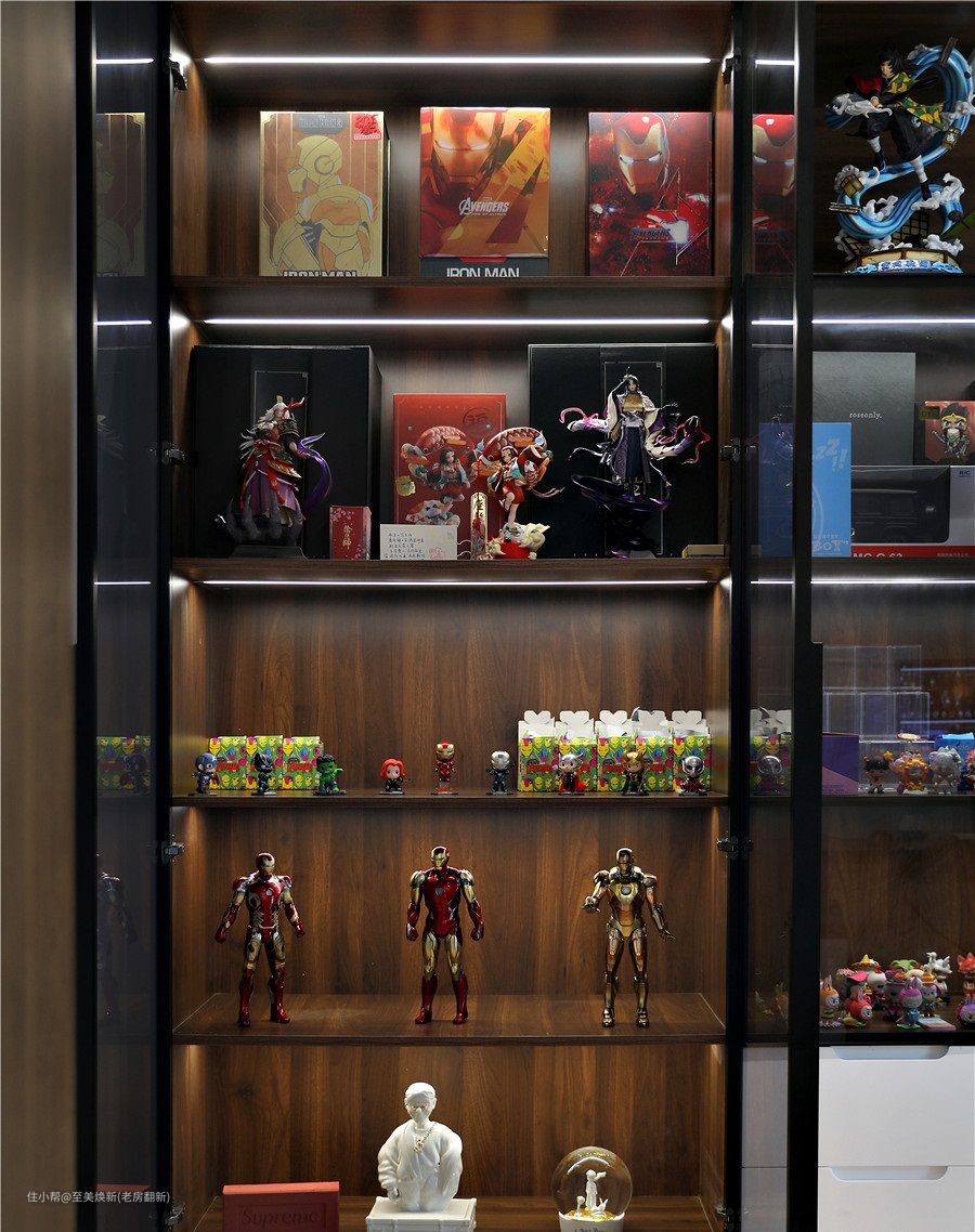 屋主是特别喜欢看书的,所以特别要求做了一个书房,整个书柜的设计都是木板➕亚格力柜门➕隐藏灯带的设计,展示性极强,再结合屋主的喜爱,用手办将空间填满,整面墙超治愈。