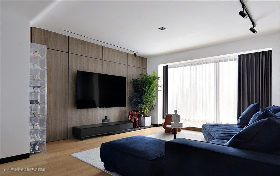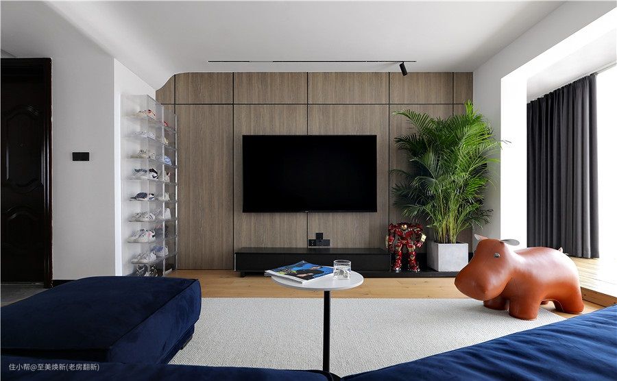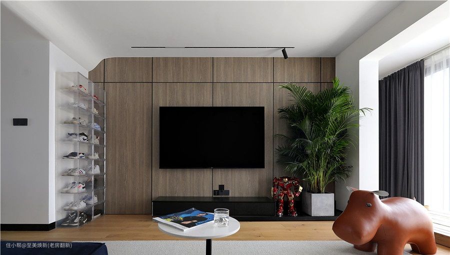 电视背景是木板上墙的设计,结合顶部做了弧形处理,两侧分别以亚克力鞋盒和绿植丰富墙面。
