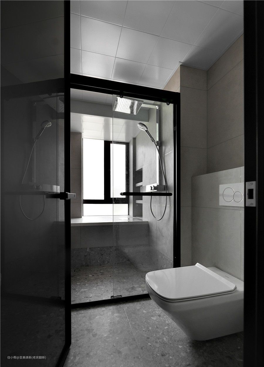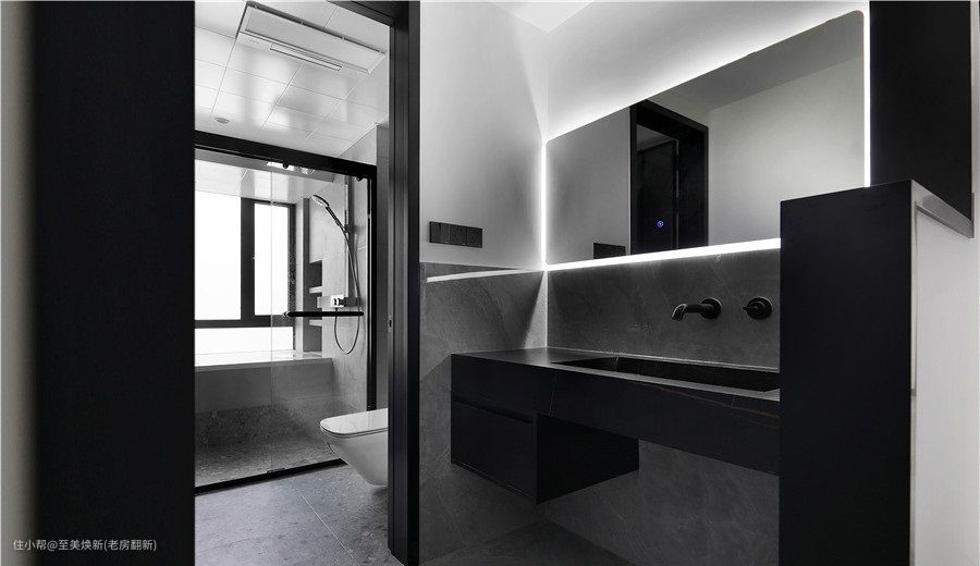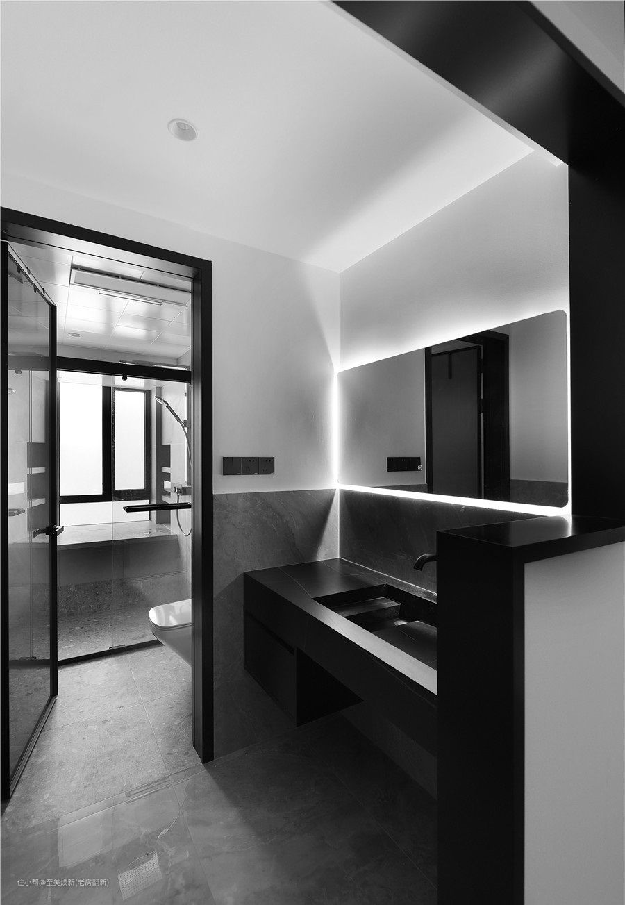 卫生间是经典的三分离设计,整体色系以黑白灰为主,搭配灯带设计,营造现代摩登感。