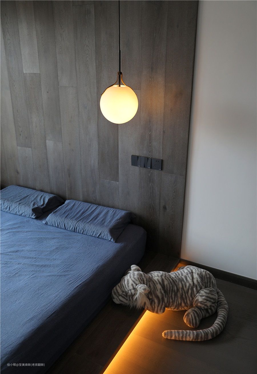 主卧地台是木工师傅现场定制,悬空木板高度在13.5cm,抬脚不会累,底部加一道暖黄色灯带,安全又美观。