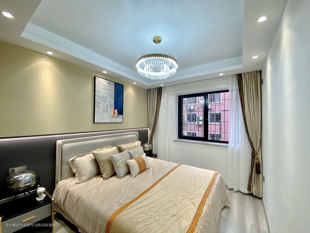 床铺后面的撞色护墙板让空间多点色彩,提高空间档次。窗帘滑轨嵌入吊顶,让空间更具美观性。房屋吊顶采用半吊。与中间的吊灯搭配,让空间更具层次感。