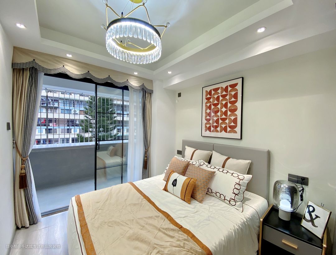 温暖的阳光透过超大玻璃门躲进房间,布满房屋各处,营造温馨舒适的氛围,让业主得以全身心放松。床铺背景墙上的风格壁画、天花板上的皇冠吊灯、床头柜上的手麦台灯,这些极具艺术感的装饰物让空间更显高级。
