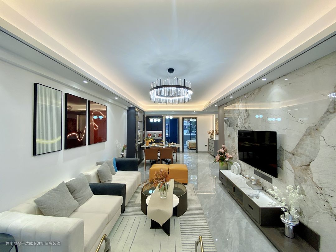 入门映入眼帘的就是非常具有特色的电视背景墙,大胆的纹理变幻将房屋衬托得更加高端大气。撞色沙发让空间更具艺术感,业主经常在此会客聊天。客厅吊顶采用半吊,并嵌入了钛金条装饰,再配上圆形吊灯,让天花板更显高级,提高整个空间档次。