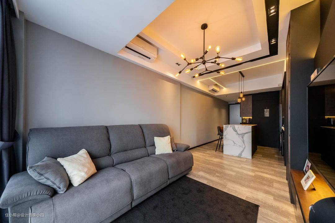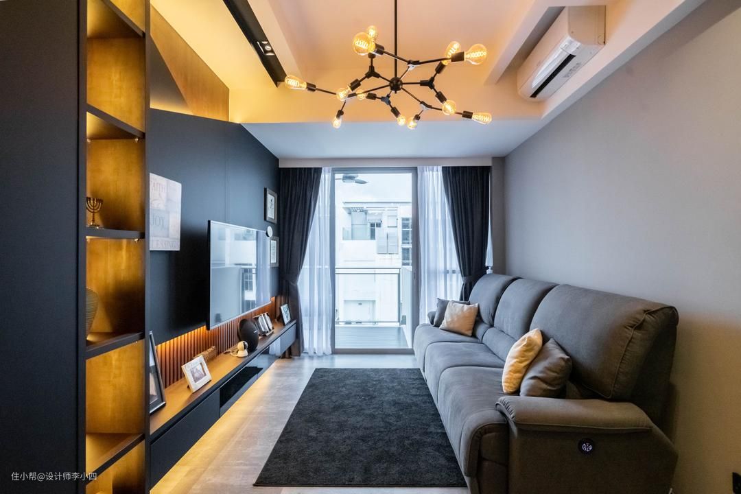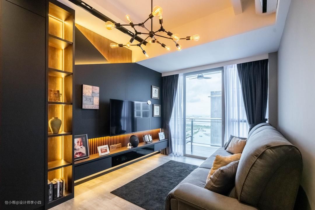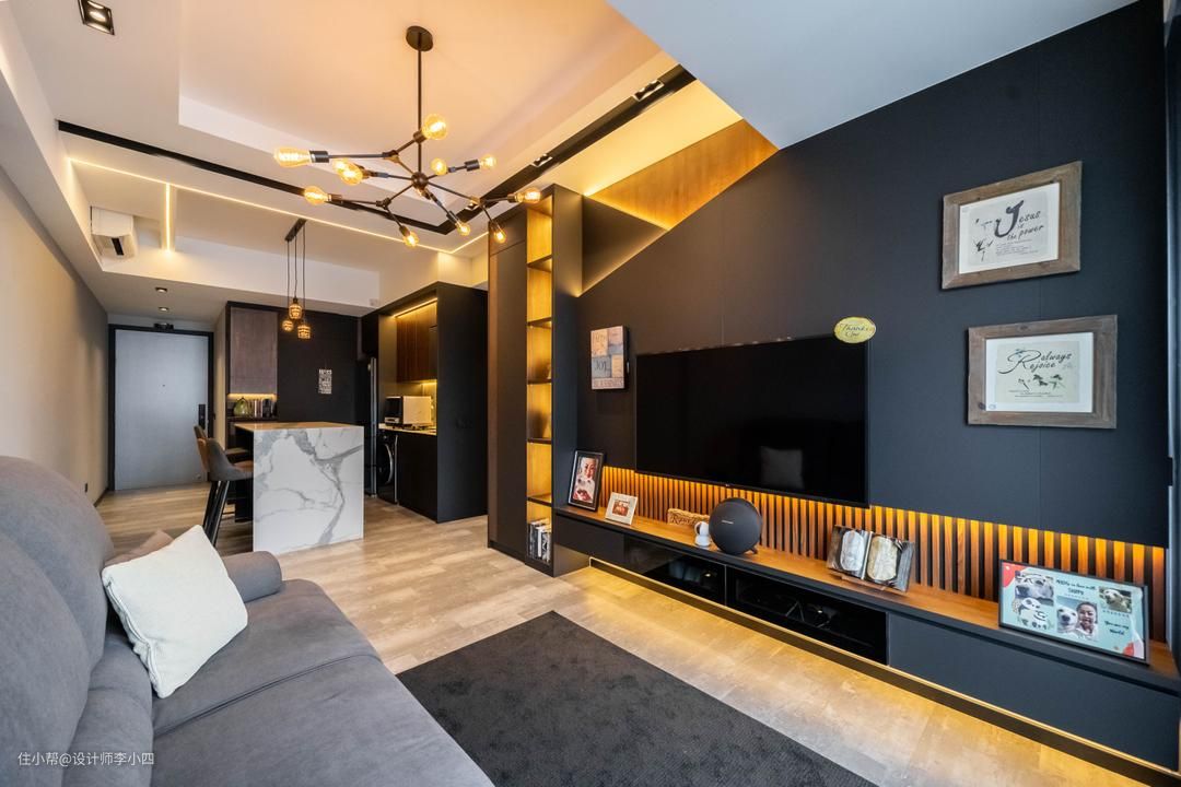 将客厅电视墙做个性造型处理,采用黑灰色作为底色,在电视墙的上部分做三角形等不规则矩形拼接设计,用于弱化客厅的横梁,避免墙顶的落差感所带来的压抑。