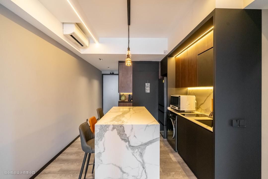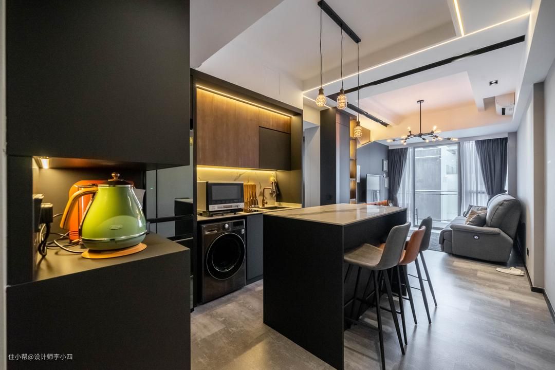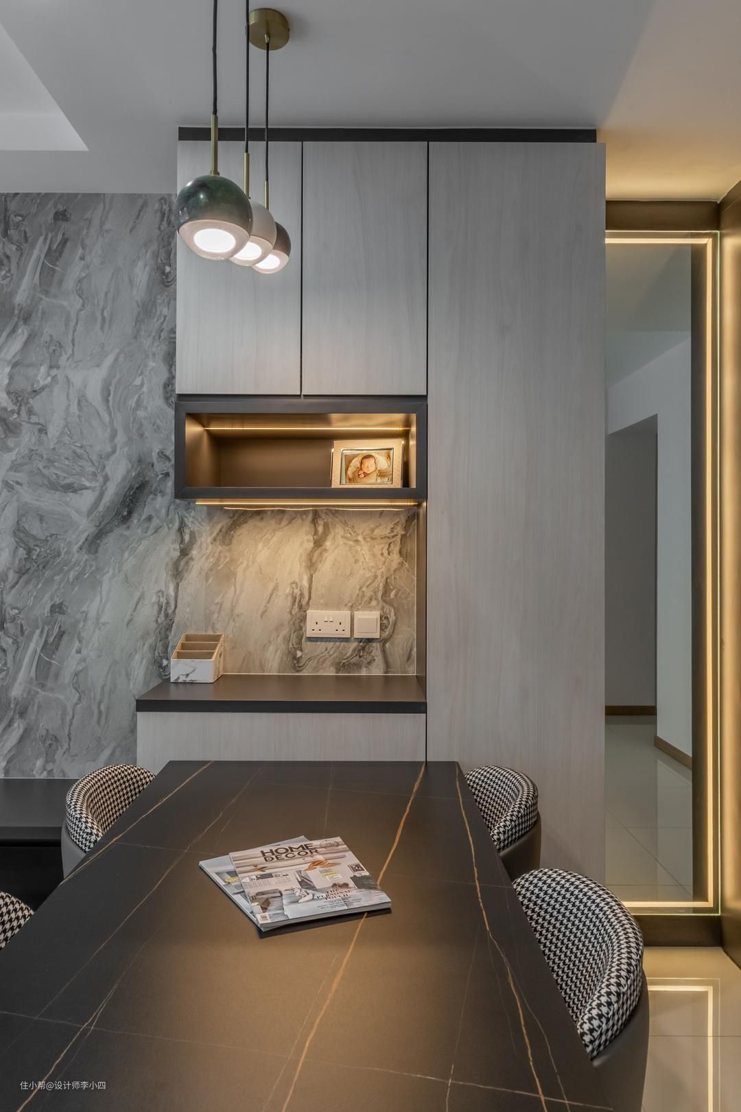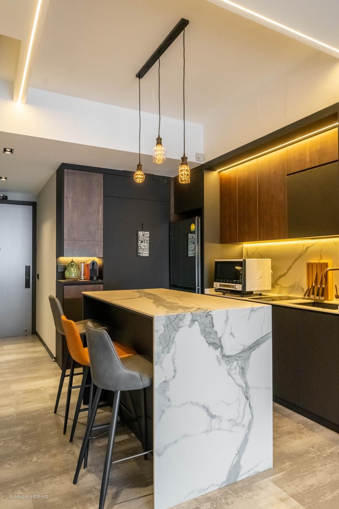 餐厅处采用固定餐桌搭配高脚凳,能够满足家里的用餐需求,在餐厅靠墙处设计餐边柜和西厨柜,用来放置餐具和冰箱等厨电,保持空间整洁。