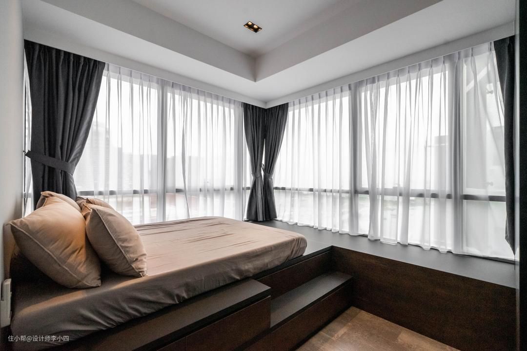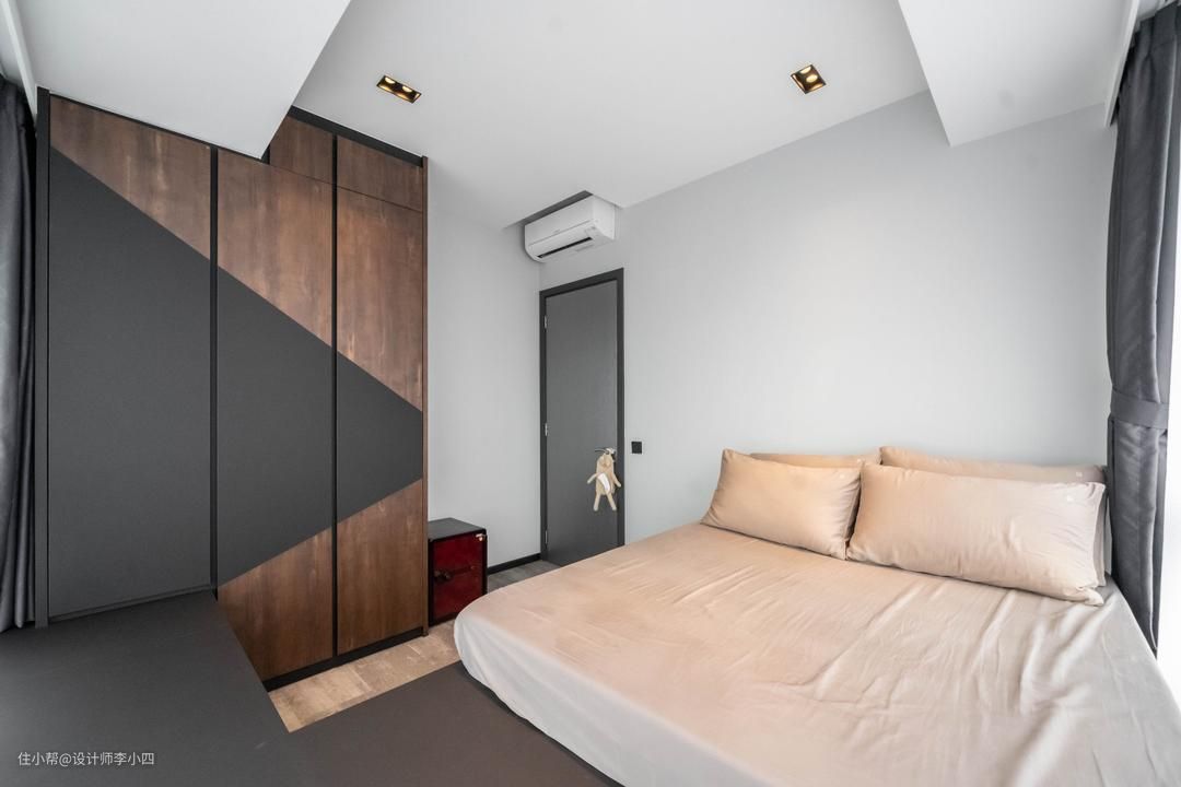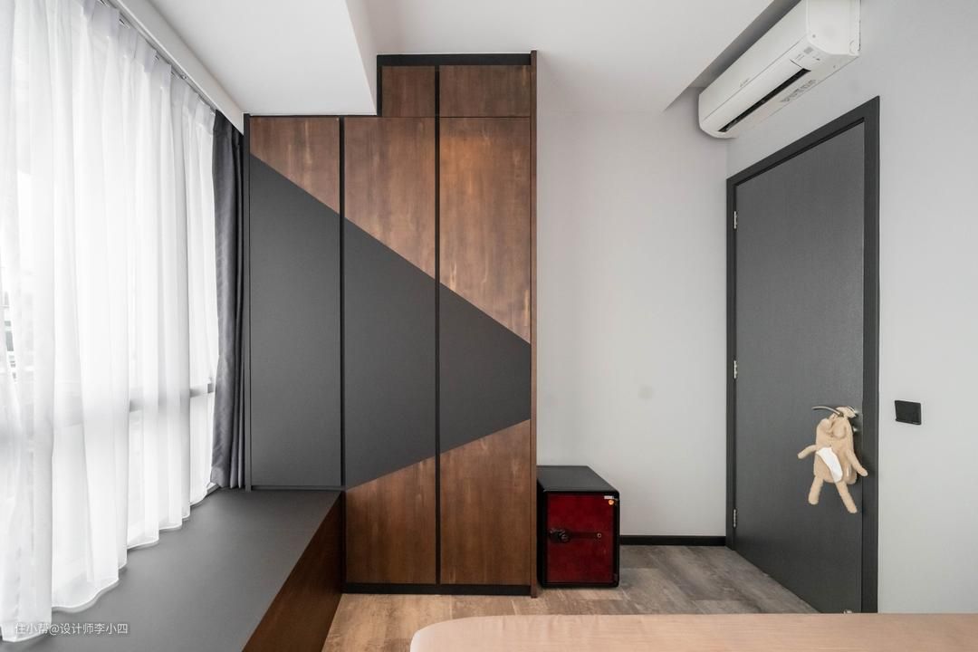 主卧内的两面墙壁都是窗户,于是沿着做榻榻米,在上方放置床垫,满足日常的休息需求,在靠墙部分则是做衣柜,柜体做上下到顶的处理,用于收纳房间衣物,保持空间整洁,在柜面上设计灰色三角形,与榻榻米共同映衬。