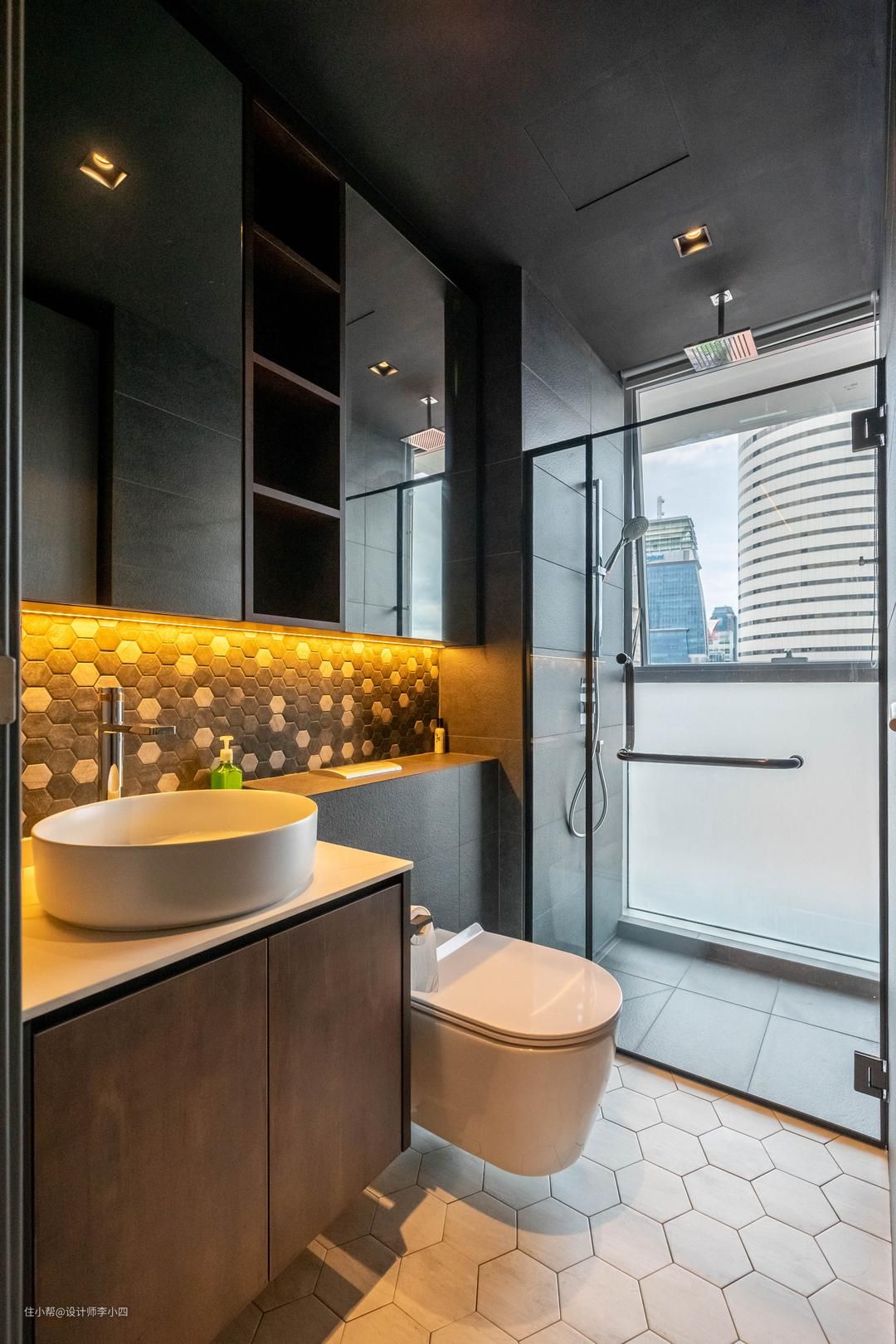 卫生间做一字型干湿分离,在淋浴区处采用升降帘,能够保证使用时的隐私,平常也能保证空间的通透和干净。