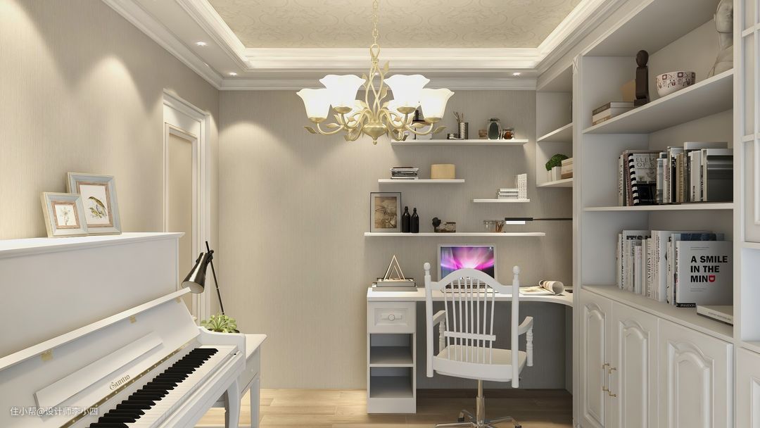 在书房内靠墙做L型的书架和书桌,在书桌的上方设计悬空错落的置物格,减少空间内的单调感,也方便放置常用物品和摆件等,在房间进门的右边则是放置的钢琴架,方便孩子弹琴。