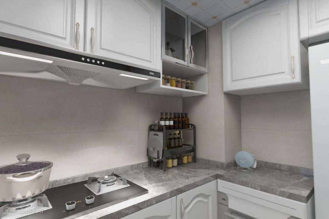 在厨房内做U型操作台,将整个空间充分利用起来,在操作台的旁边留出空间放置冰箱,进行合理布局,为家里营造宽敞整洁的做饭环境。