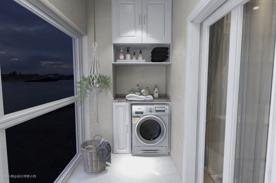 客厅带有大阳台,在阳台的两端分别设计洗衣机+收纳柜做上下式一体组合、置物架,充分利用空间增加阳台的功能,也能够满足家里的晾晒洗衣、养花的需求。