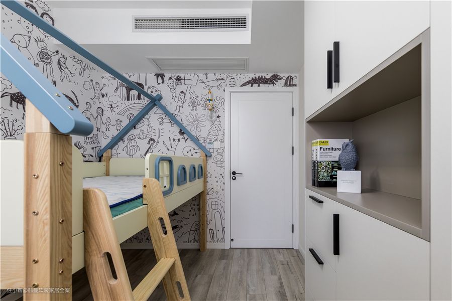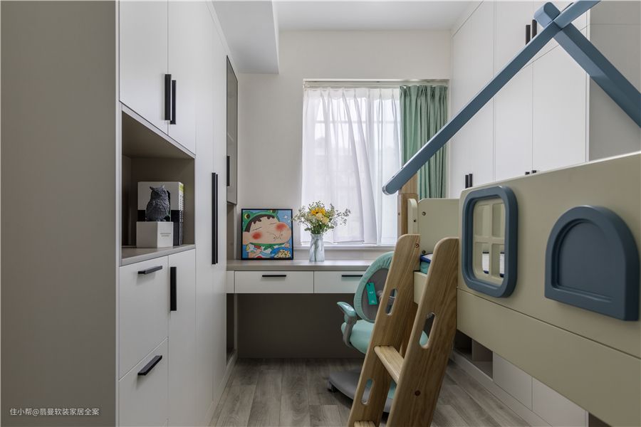 次卧整个墙面且有卡通墙纸,儿童房增高设计,给孩子打造设计感的床,下方是储物空间。整面定制储物柜,衣物和书籍玩具的储存,形成整洁的收纳,有条理,拿取更方便。