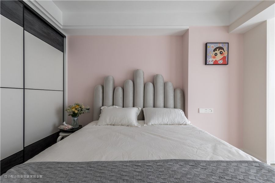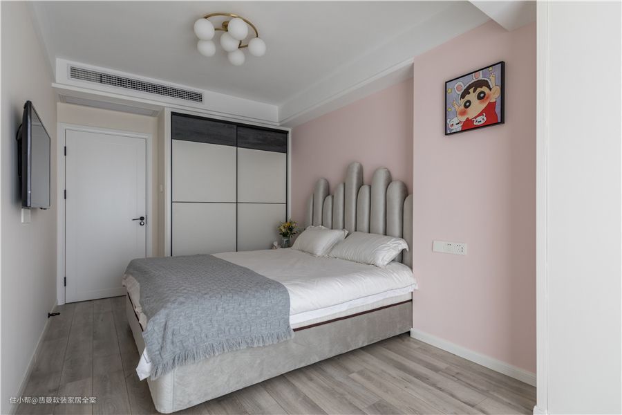 粉色+灰色的主卧色调简直太温馨了,享受睡眠的熟睡是时刻,左侧一整排的收纳,不用担心衣物的收纳问题。高矮布艺软装床靠背,圆形主灯,赋予空间设计感。