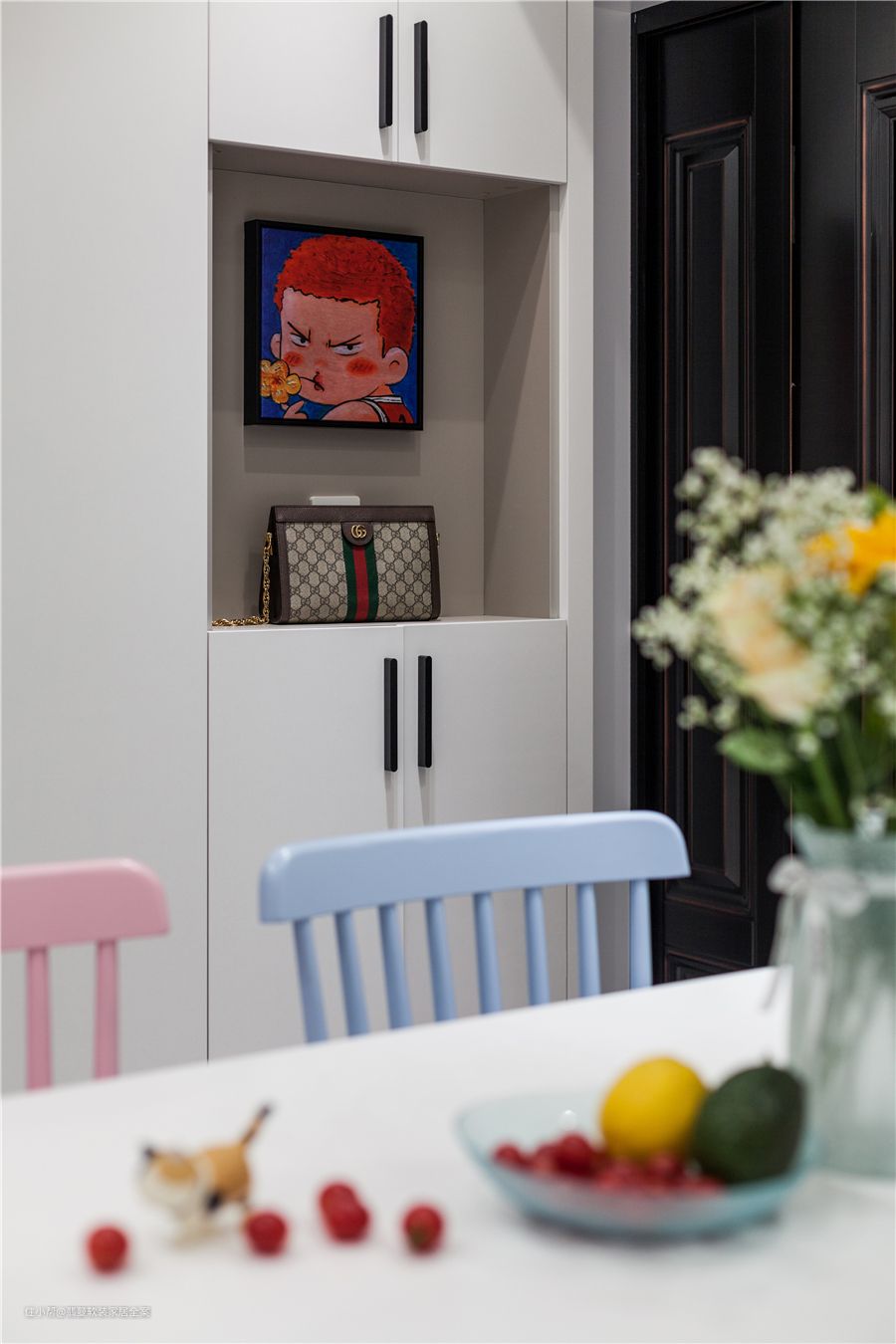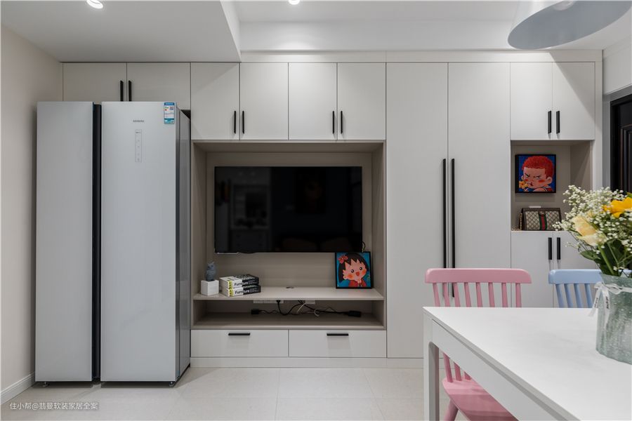 定制柜是整面墙连体打造的,集电视机柜、餐边柜和玄关柜与一体,大大增加了室内的储物空间,将电冰箱镶嵌于其中,电视机嵌入其中,设计上不紧不慢,收纳仅仅有条。