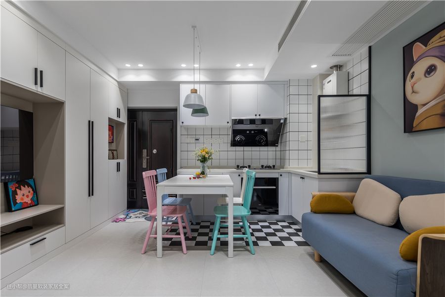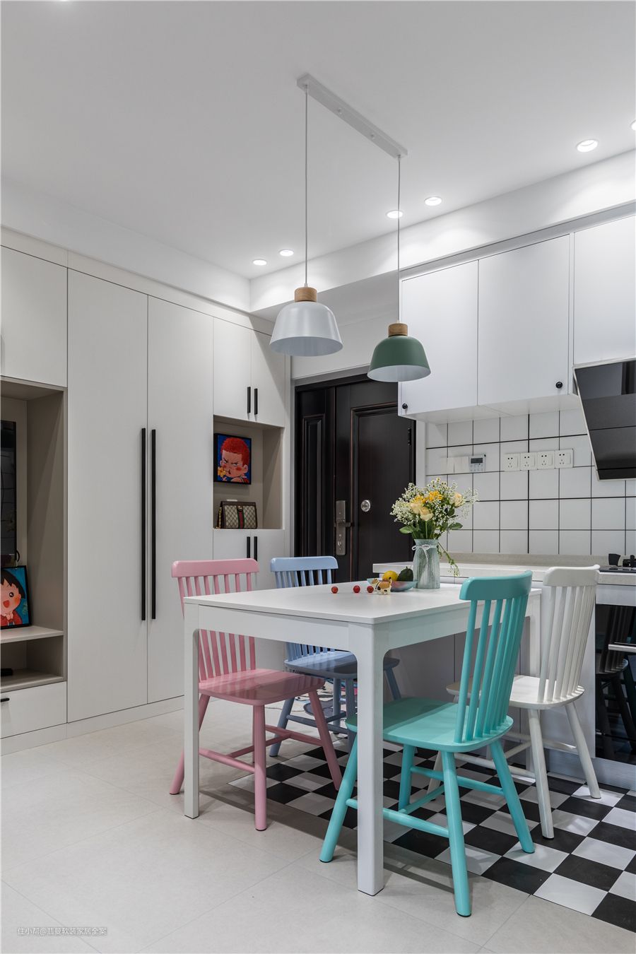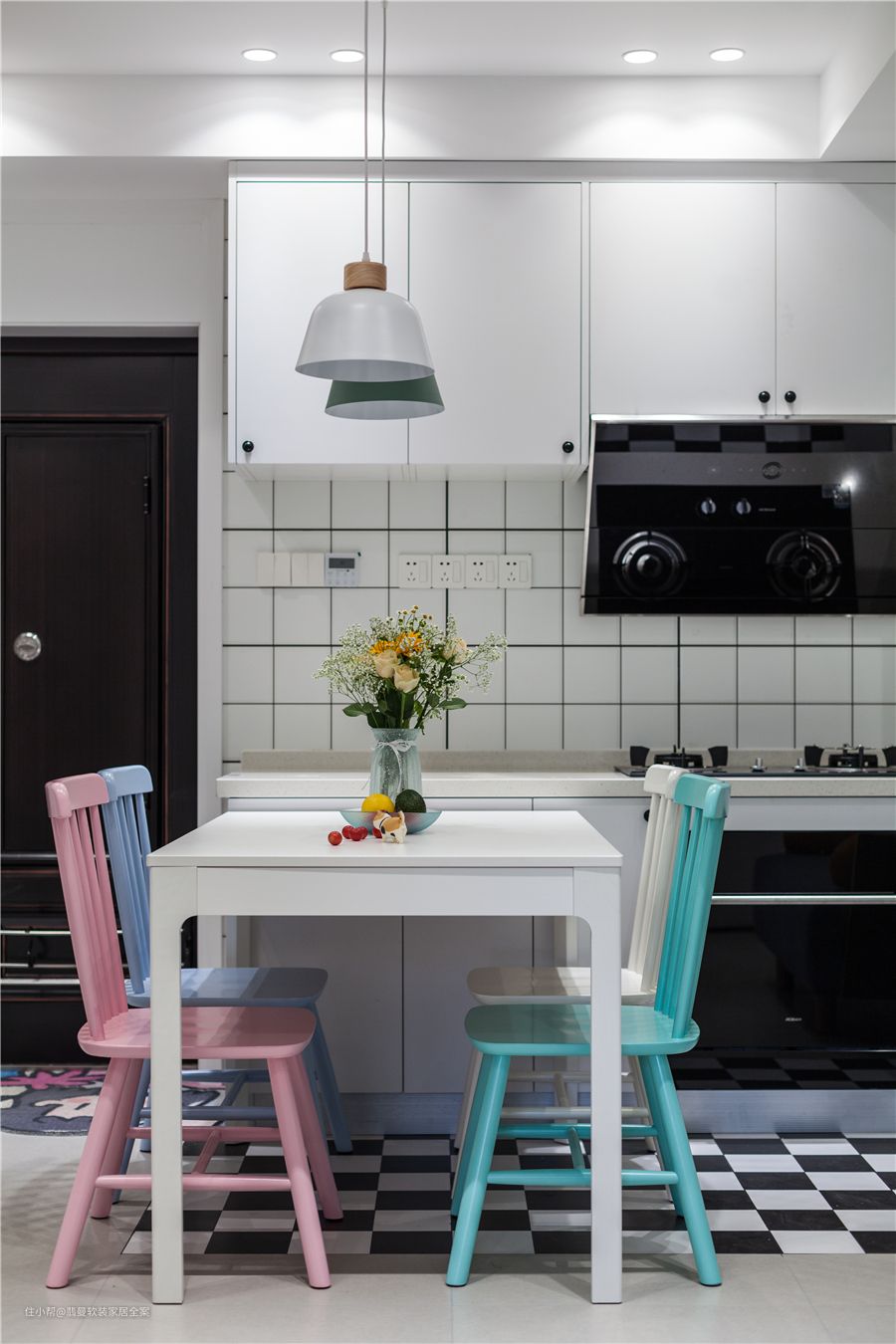 开放式厨房设计,保持空间通透开阔,同时增加互动体验。黑白地砖形成空间区分,保证厨房使用便利,白色方形小瓷砖搭配大理石台面,使用便利,卫生好清理。