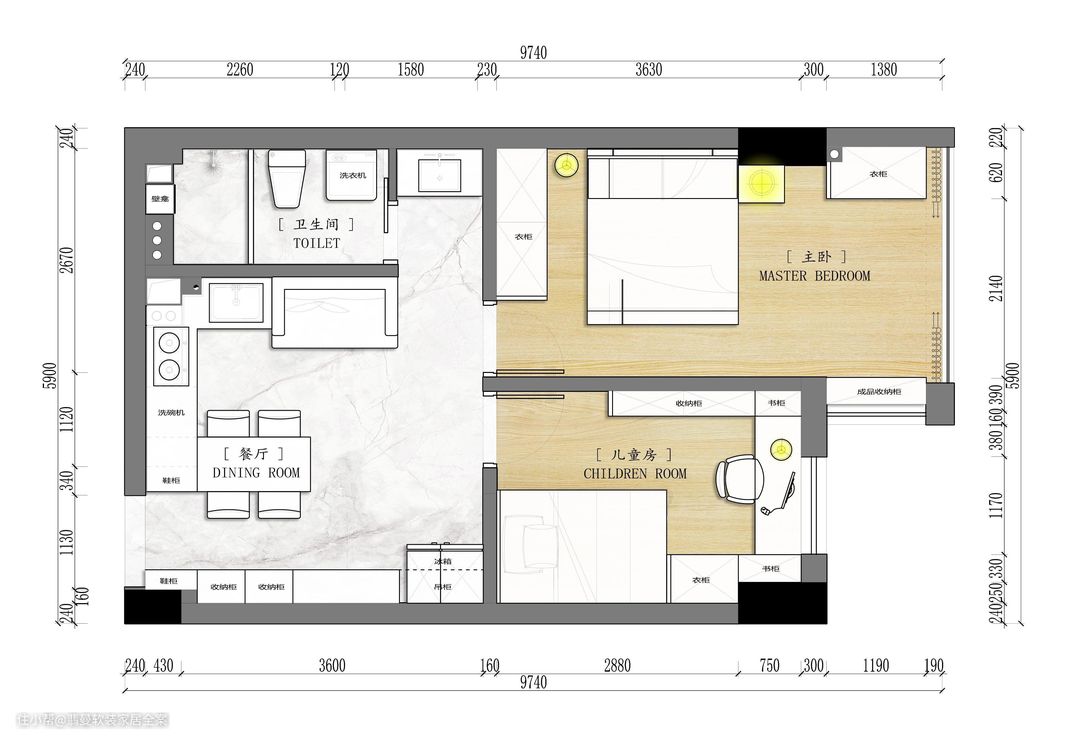 装修布置图,对空间进行重组,客厅空间借用部分卫生间面积,增加室内面积,使得空间餐厅客厅和厨房都融入其中,集玄关餐边柜和电视机柜与一体,更好更多的实现室内储物。不同的空间呈现不同的效果,满足大量的收纳需求,同时营造出生活情境。