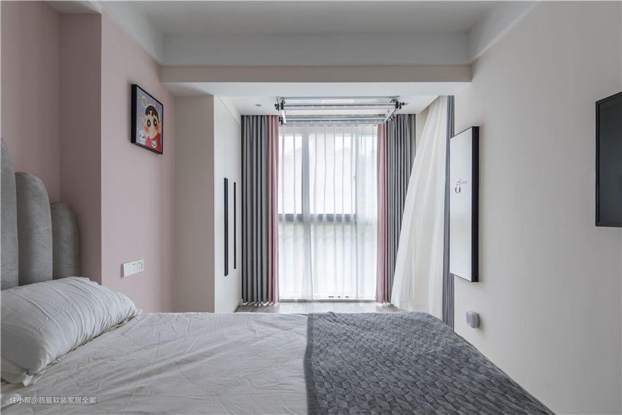 主卧打通了阳台空间,室内更加通畅,空间不局限。并且定制储物柜,储物空间双倍利用,储物超舒适。粉色乳胶漆和软装,营造温馨氛围。