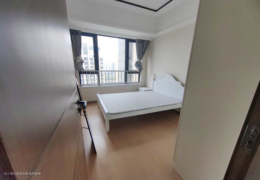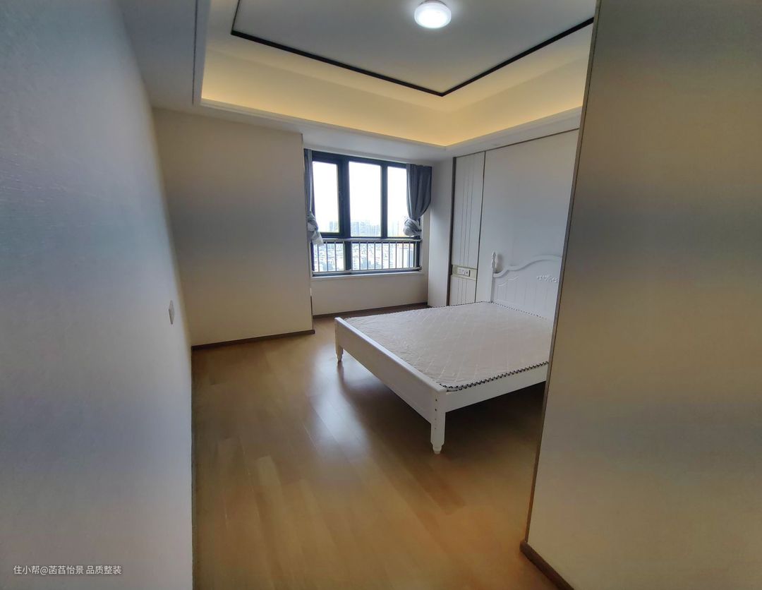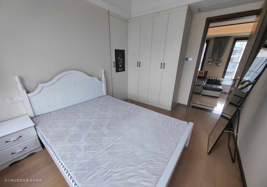 次卧的空间中,以简单舒适为主,一张白色的双人床搭配着一侧的床头柜,满足日常生活的需求,整个空间都以浅色系为主,阳光透过窗户,照进室内,整洁大气。