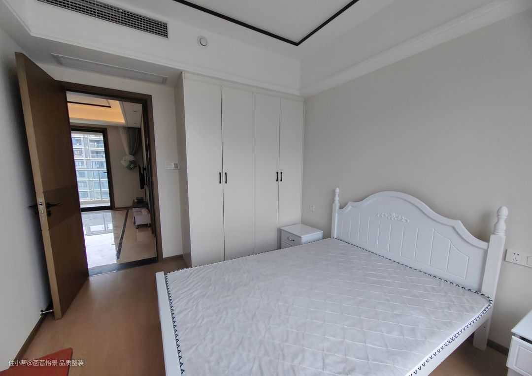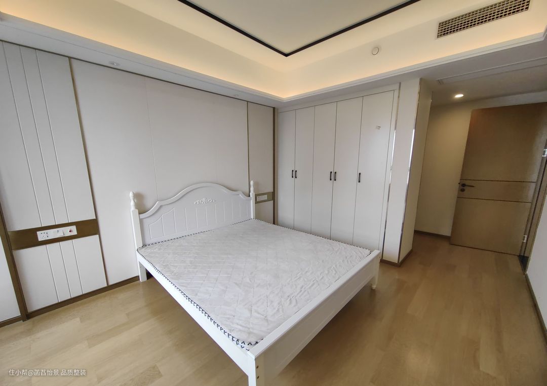 主卧的背景墙做的一些简单的造型与装饰,奶白色的背景墙搭配着纯白的双人床,定制的柜子做的到顶的设计,增加空间的收纳面积。