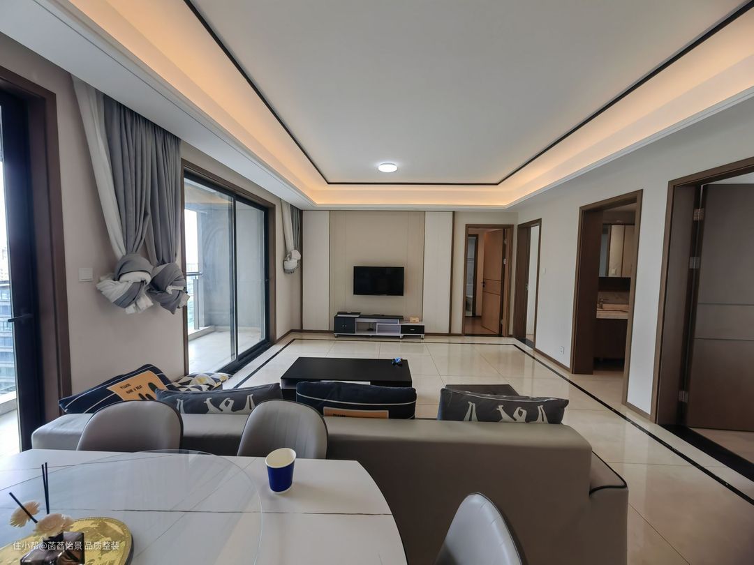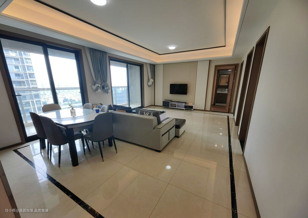 客餐厅是一个大横厅,大面积的落地窗为室内带来了充足的采光,顶部利用灯带与吸顶灯进行照明,营造出一个精致大气的空间氛围。