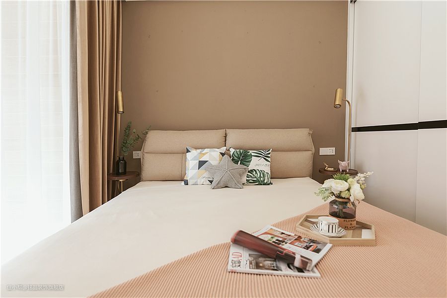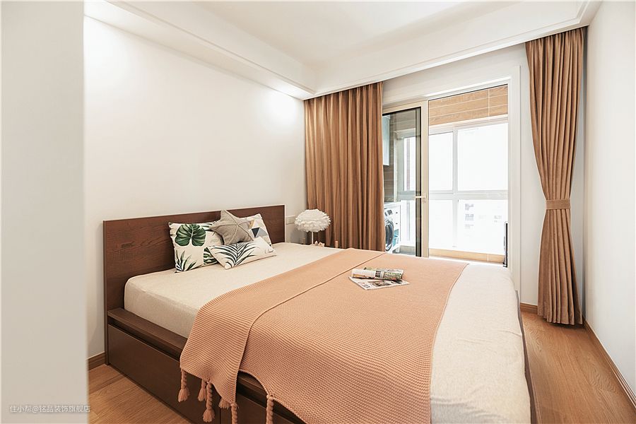 粉色+原木色,构建舒适的睡眠空间。有层次的设计在简单中体现高级,如同窗帘、地板、床的颜色也在层层递进中。