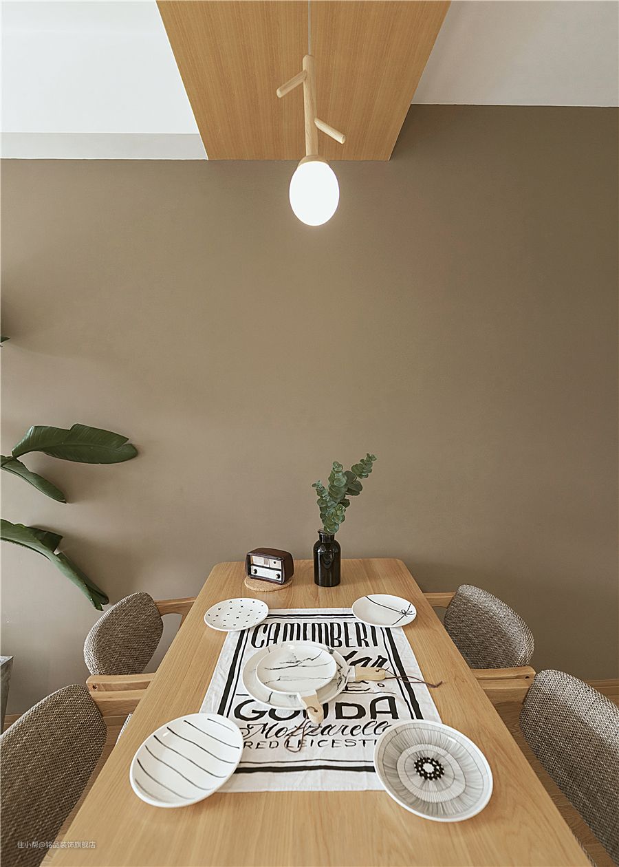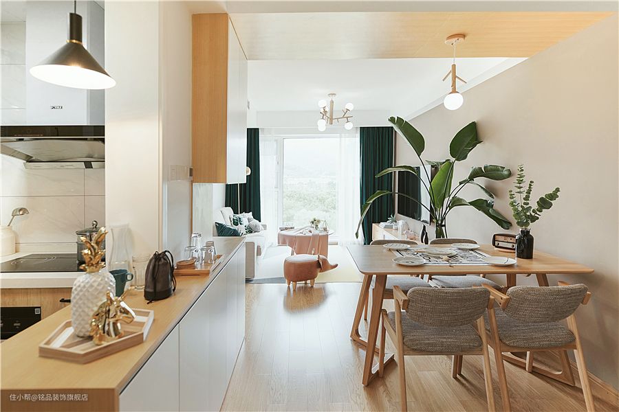 就餐区也同样延续着简约的北欧风格,原木枝丫吊灯、木色桌椅,搭配自然的绿植,整个用餐空间弥漫着文艺的气息,简约又高级也不会审美疲劳。