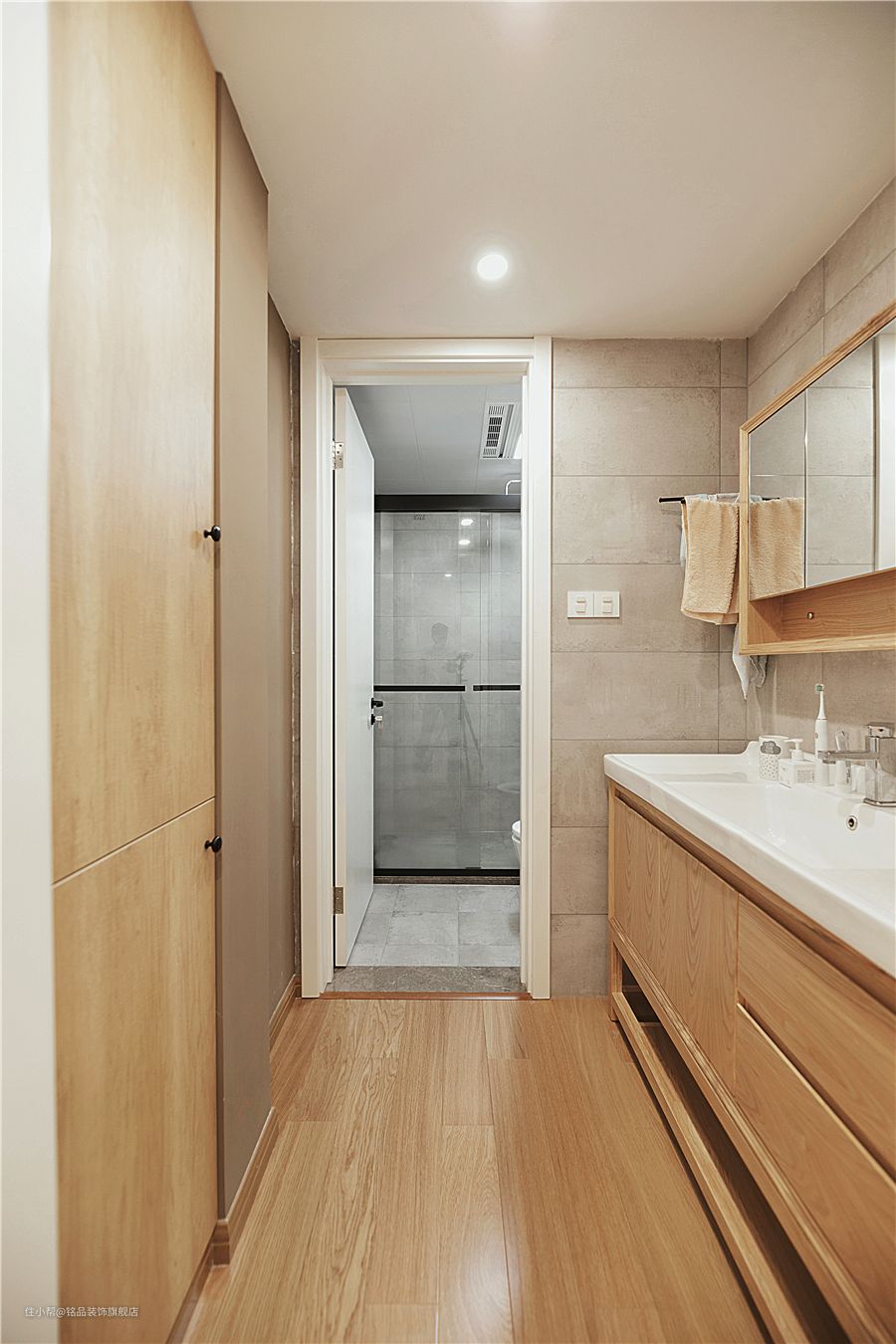 两个功能区以不同的地砖做区分,淋浴区用瓷砖做地砖,易清洁打理。台盆区以原木材质为主,狭小的卫生间内充满清新自然的气息,精致感满满。