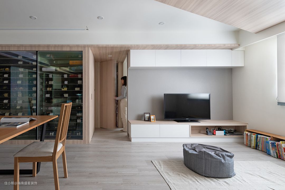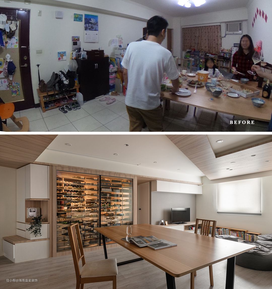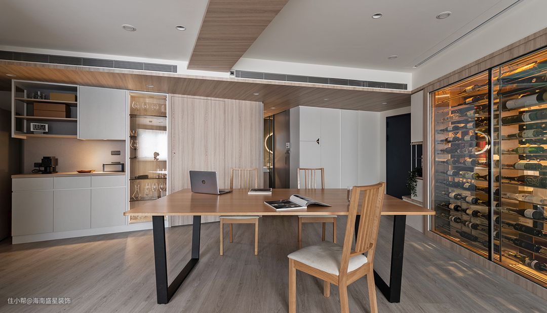 关系密切又好客的一家四口总喜欢窝在餐桌四周,家的时时刻刻都是最热闹模样,然而,对比住家极为独立而疏远的布局,总显得格格不入,随着孩子渐渐长大,那份想要好好陪伴他们成长的心念,就促成了这次改造计划。 盛星装饰意识到过去隔间方式不只阻挡亲子交流,还形成多处暗角,棘手畸零处更让屋主无所适从,于是在难解的梯形空间中,突破既定框架,大胆地将空间轴线转了30度角,用一张大餐桌纪录家最丰盛的光景。 Q:本案在面对梯形空间时,如何重整格局? 原始梯形平面被切分成零散、零互动的长型空间,使得屋主常因空间限制而烦恼,因此挣脱梁柱走向,并以一家人的生活重心「餐厅」为轴心,放射状布下生活场域;同步藉由集中机能区于畸零处,重塑每个居室方正轮廓。 Q:因应领域划分关系,本案如何处理天花梁柱? 空间蓝图在转了向度后,形成斜梁横贯情形,但考察屋高只有270公分、梁下仅剩230公分,设计上以维持净高为优先,不做刻意隐藏,反倒是于梁面粘贴木皮,借温润气息稀释压迫感。 灯光则顺应天花条件,舍弃容易压缩高度的间接照明及吊灯,大量采用嵌灯保有视野穿透性,另于多用途的餐厅与吧台装设可调色温的灯具,让场域依着灯色渲染不同情境。 Q:空间如何带出生活五感? 除了从设计表现视觉、建材表现触觉外,还回归到居家环境,听、味、嗅觉其实都关乎隔音、气味甚至湿度。 由于屋主常邀酒友一起聚餐品酒,又加上开放规划容易造成回音,这回善用本身梯形平面,挡下声波反射,连同厨房区都刻意增加进退面,弱化酒窖玻璃墙反射而出的回音;亦顾虑厨房油烟问题,不只加强厨房抽气设备,包含运用低甲醛、或含有圭藻土、竹炭等建材,不外乎是对于五感的重视。