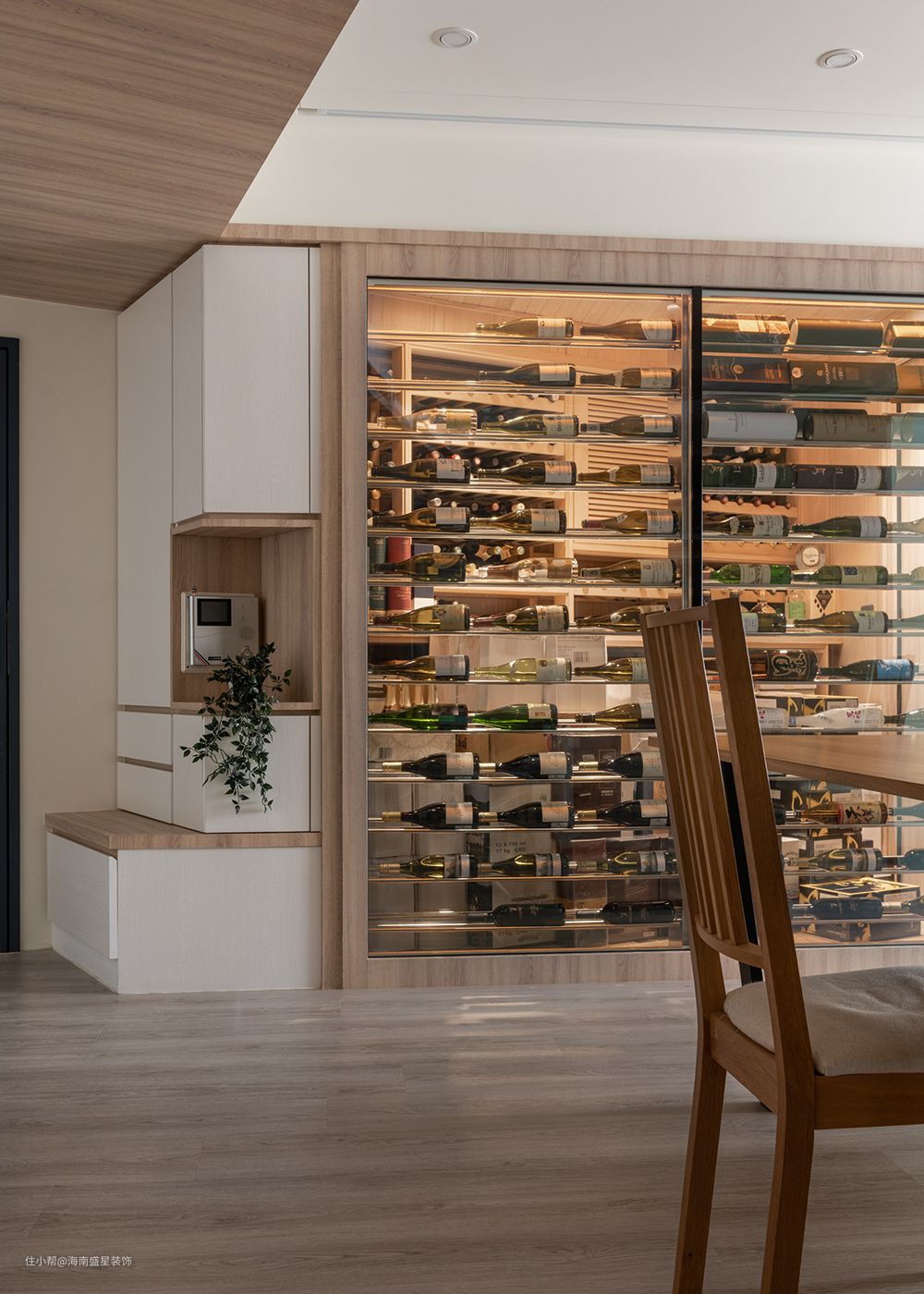 降板的木质天花下,收纳柜顺着鞋柜深度水平推出,作为轻食备餐区,也借此筑起酒器展示柜,这面柜体就如同厨房的延伸。