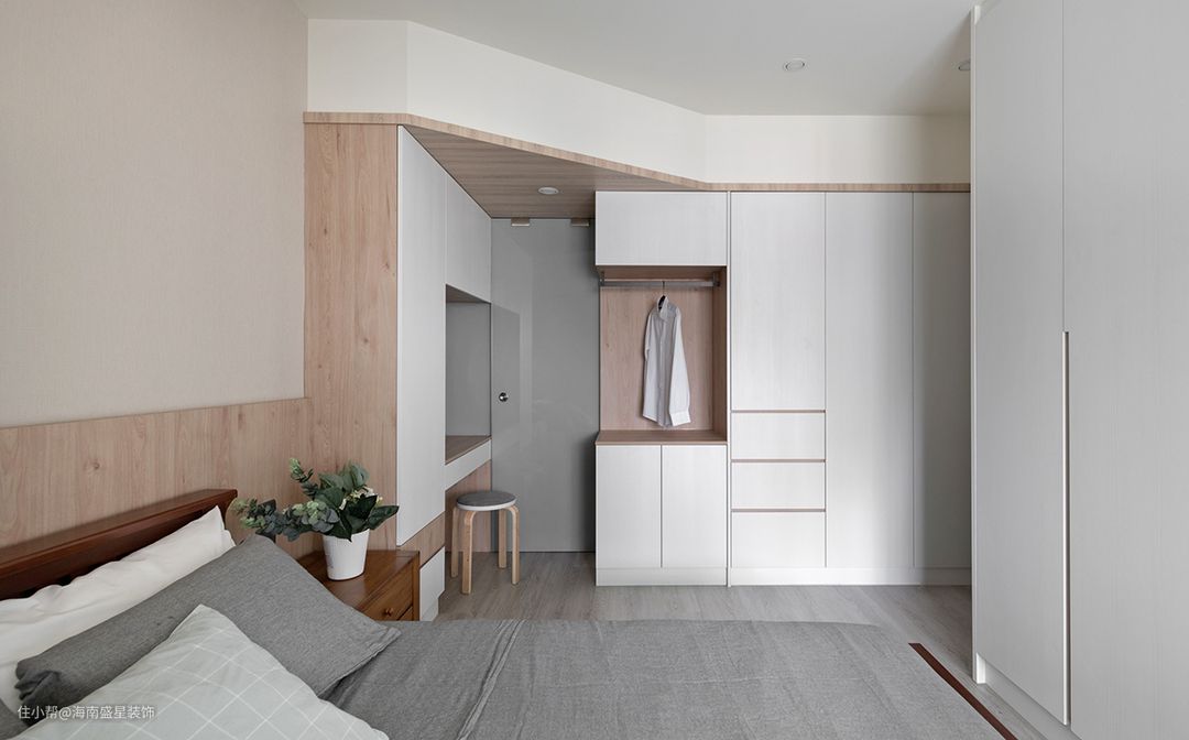 转身一看,局部降低的天花藉由连接两座柜体,示意了领域过渡,而两个口字柜便是梳理了盥洗前后习惯,将污衣区和化妆桌置于靠卫浴一侧,以细微观察流畅日常大小事。