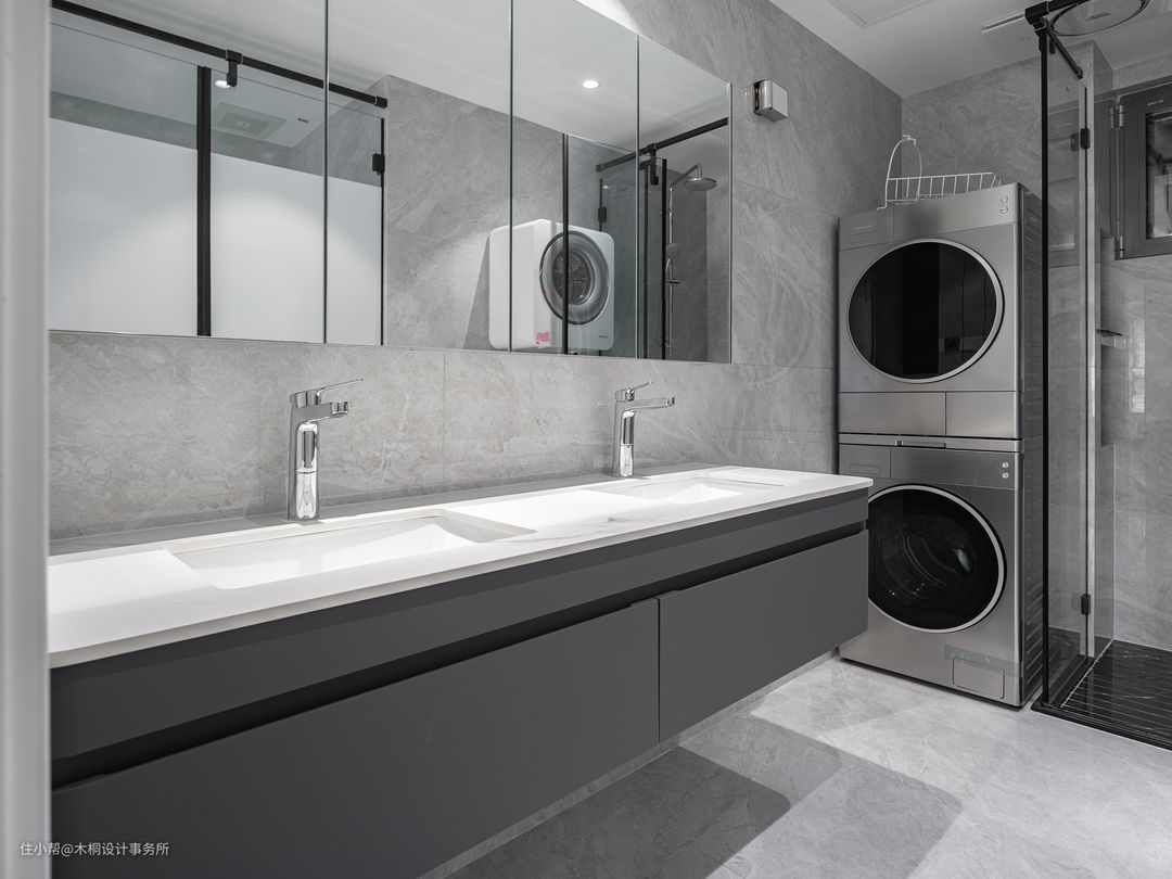 占地7.5㎡的卫生间做了四个功能区间:双台盆区、洗衣干衣区、淋浴间和马桶间,满足功能性与舒适性。