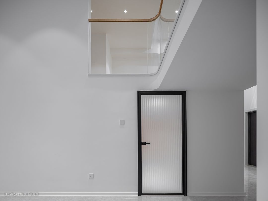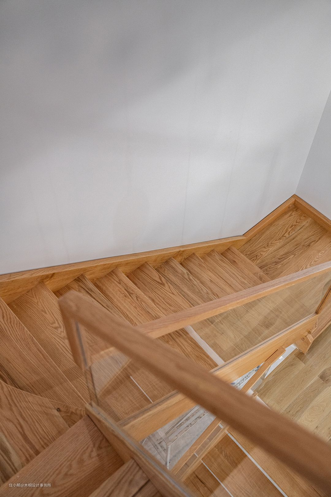 顺着悬挑楼梯上楼,来到了二楼的核心位置。优化了上下楼梯间“垂直贯穿”的呆板格局,将楼梯移位至一、二层的挑空区域,通过安全玻璃扶手和两跑的转角浮空楼梯,上下层空间的场景转换意识得以增强,既是对一层空间通透性的进一步补充,入户动线也变得更加开阔和自然了。