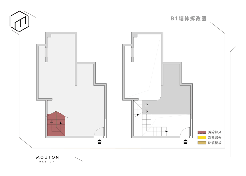 1F:①改建楼梯位置,依窗设置悬挑楼梯;②缩小客卫面积,补充客厅及玄关收纳;③拆除厨房实体墙面,安装四联动吊轨移门,引入光线。