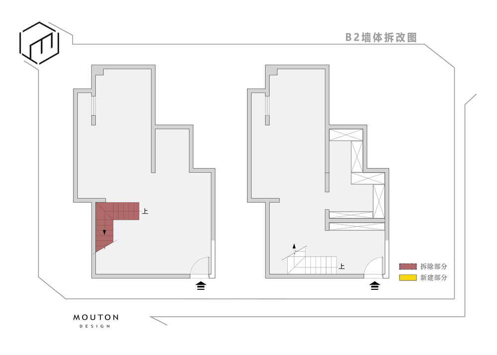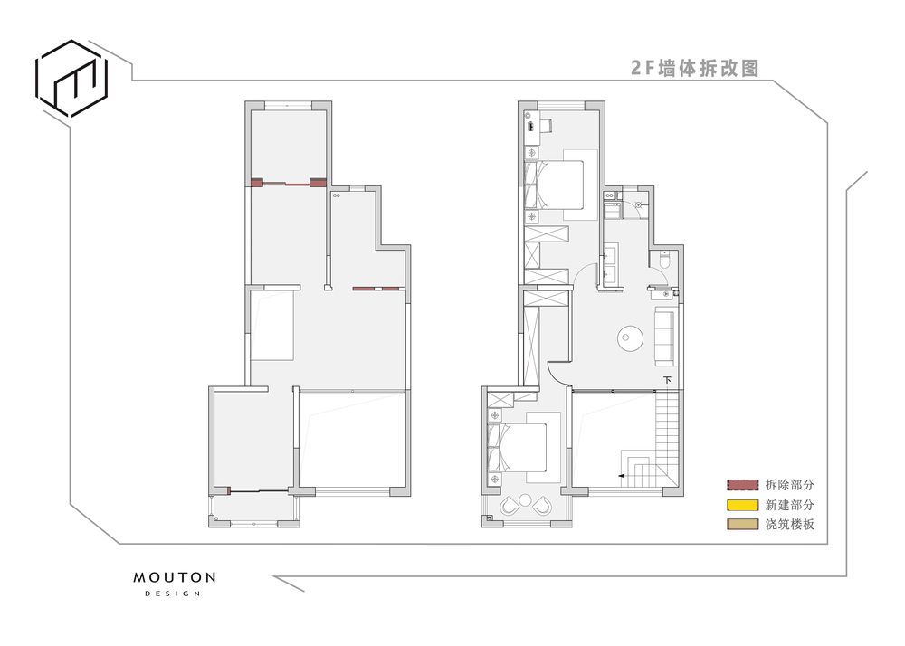2F:①原楼梯位置浇筑楼板,增设衣帽间;②南北两个阳台封窗拆除移门,扩容主卧和儿童房面积;③卫生间更改门洞位置并重新布局空间,完善使用配置。