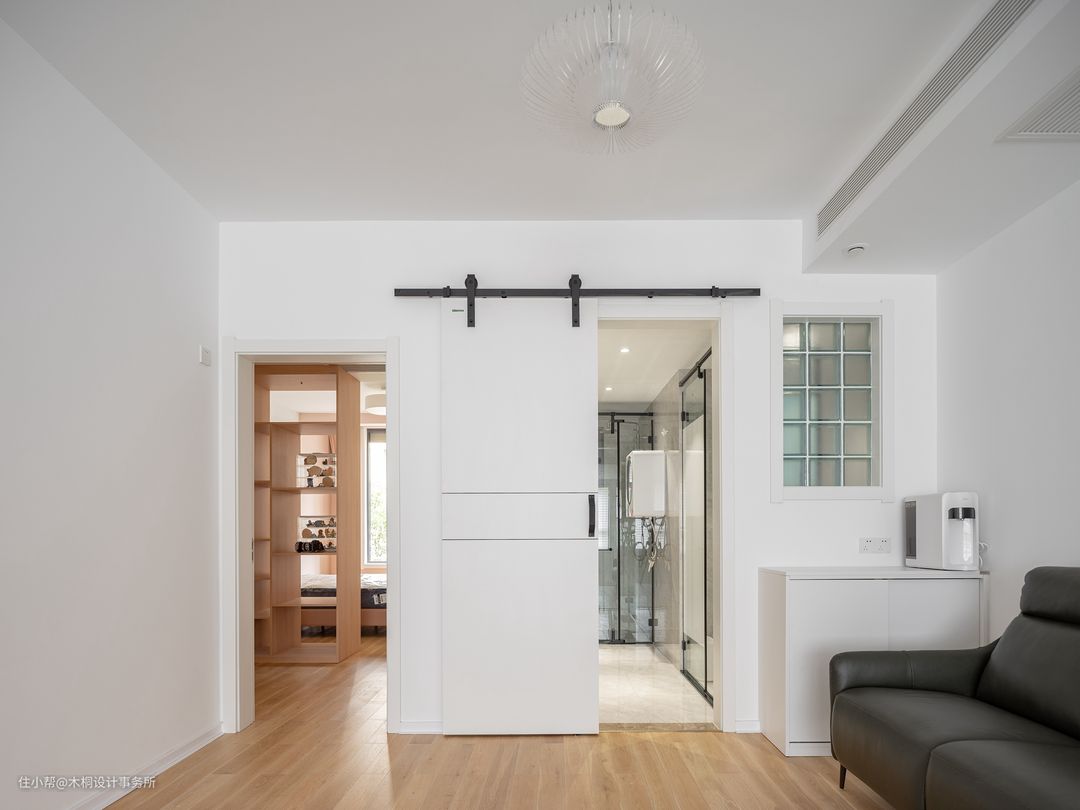 厨房原始的门洞宽度仅有970mm,导致厨房的采光受限,改造后拆除靠餐厅的整面隔墙,扩充门洞至2800mm,并安装四联动的吊轨玻璃移门,隔绝油烟也能拥有良好的采光通透性。 Tips:由于吊轨移门的自重性很大,因此需要将导轨顶部的安装基础用钢架进行加固。