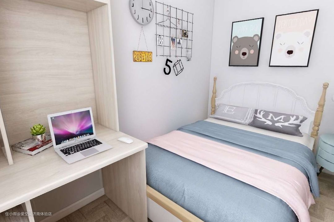 床位的立柜上方背景墙追加了一些记录板,还自带小收纳,放一些指甲刀小剪子,黑板记事更清楚。
